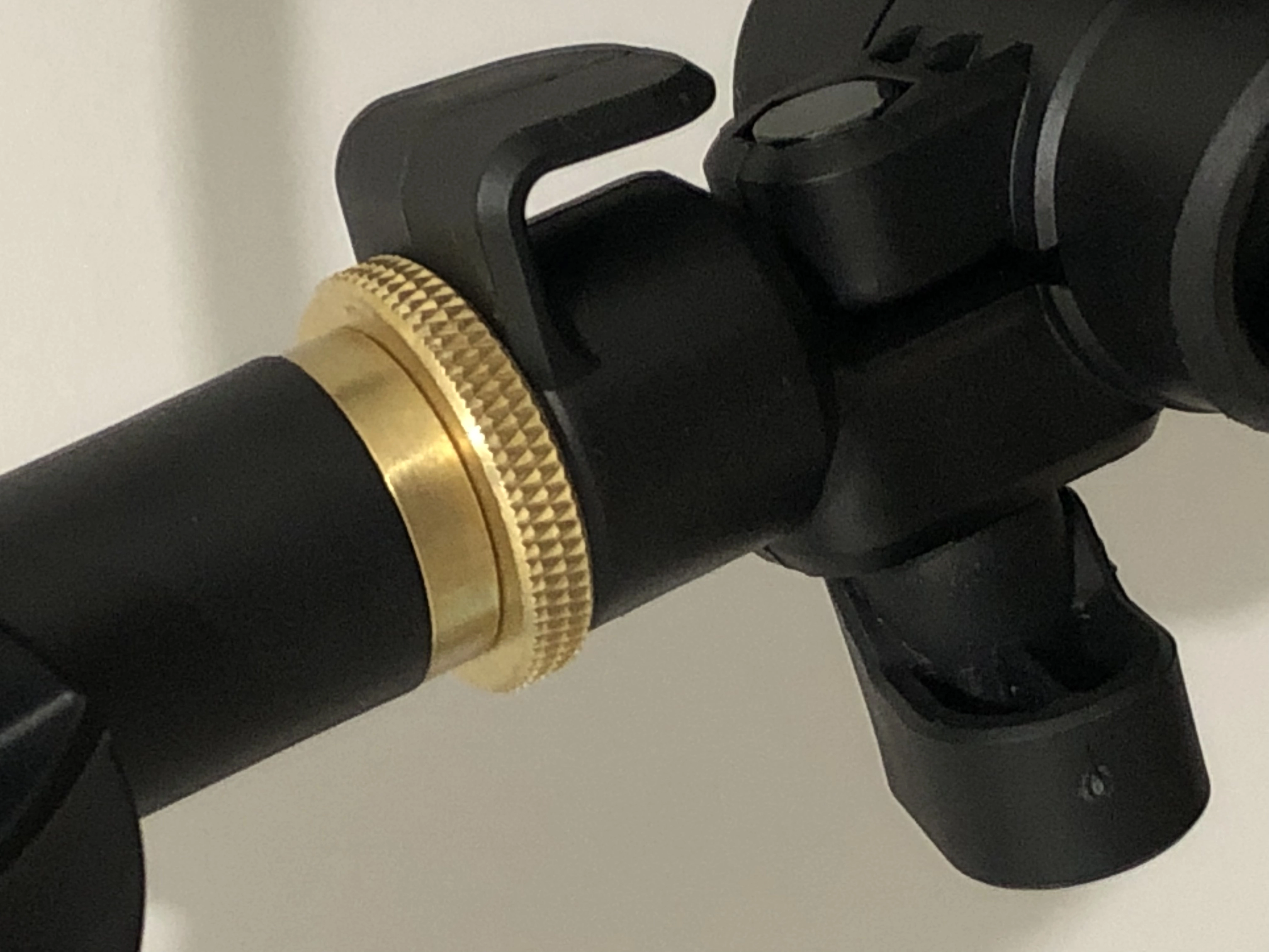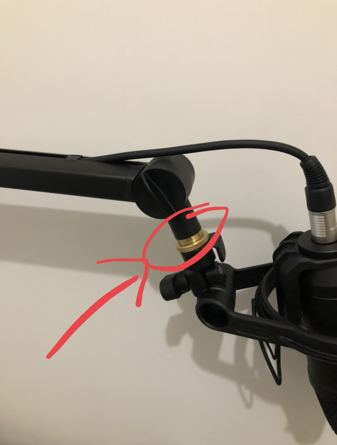 I'm guessing you need to lock on to the knurled brass piece with something like pliers, and then turn the shock mount. You don't want to apply the pressure through the boom arm. Remember the old adage.... righty tighty, lefty loosey.