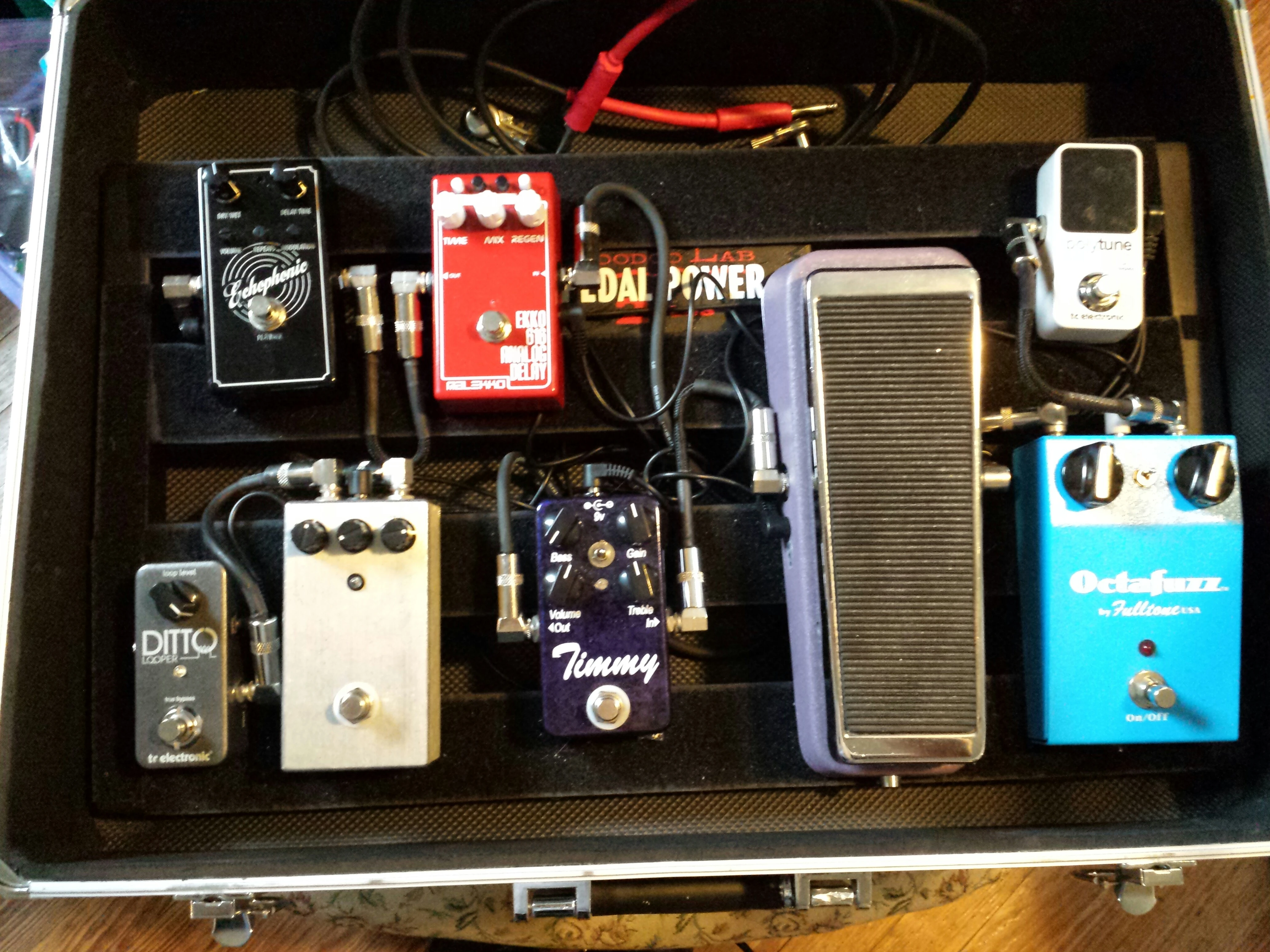 Dunlop Crybaby -> Korg Pitchblack Tuner -> MXR Custom Comp -> TC Electronics Nova Drive -> Goodrich 120 -> Eventide Modfactor -> Strymon Timeline