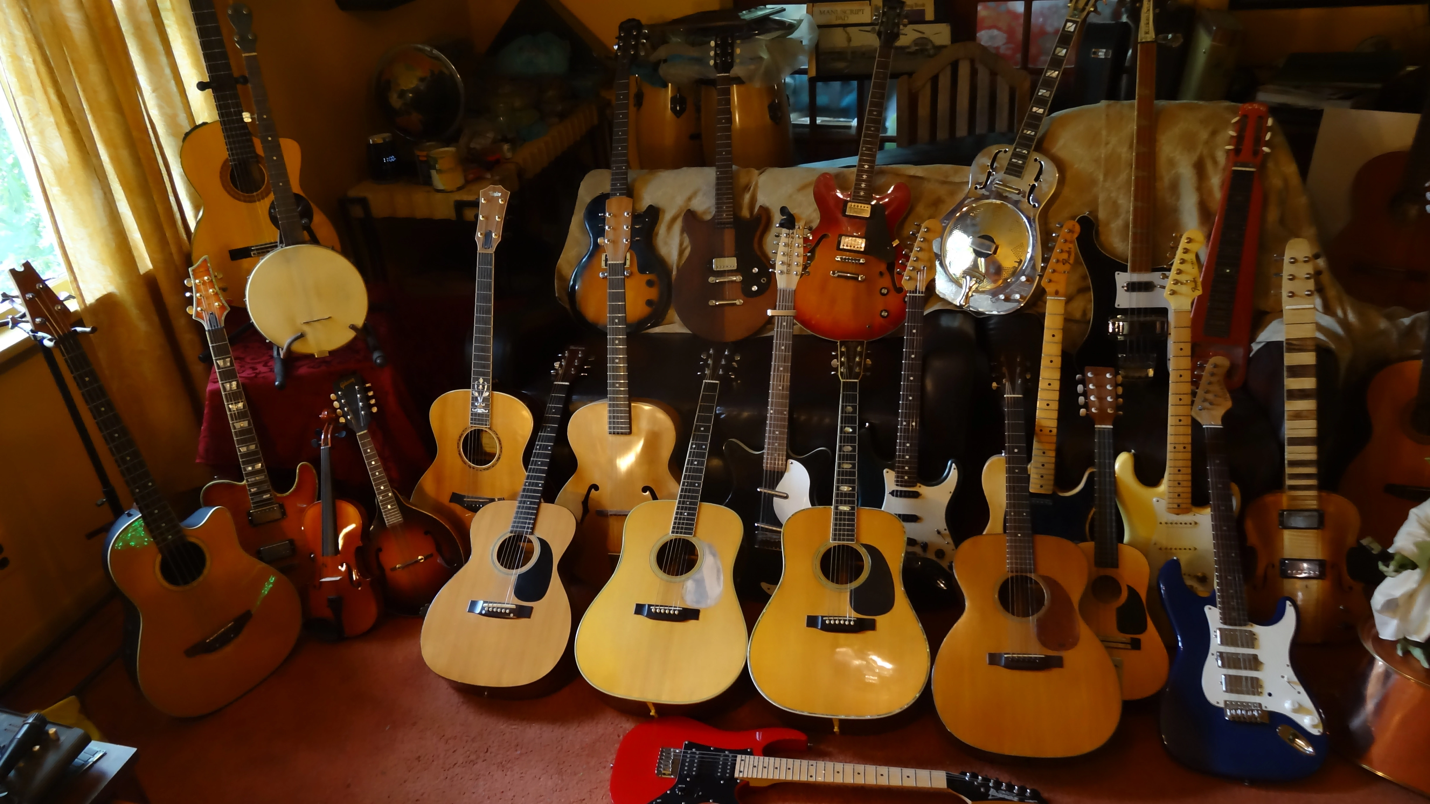 I need a Tele.Hmm. Maybe I’ll play a little. I got a lot of guitars. All kinds of shit. Not a single PRS though. Just a bunch of shit. Here’s a few getting a tan.