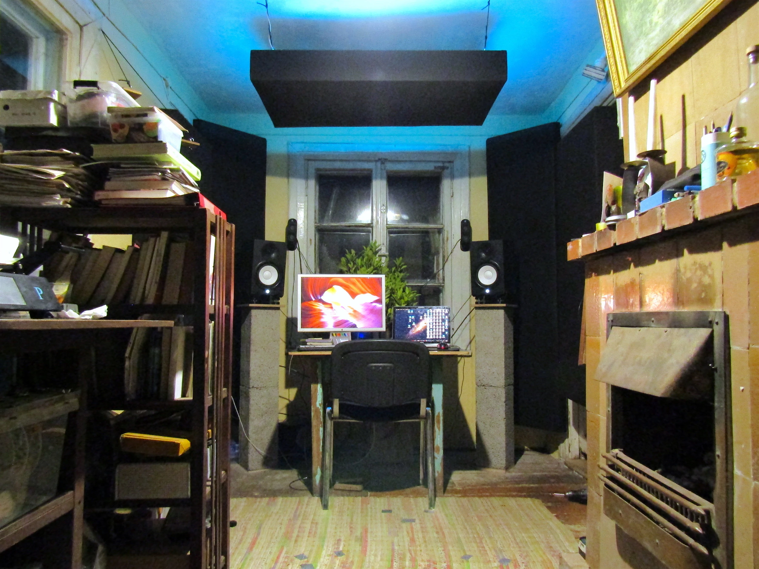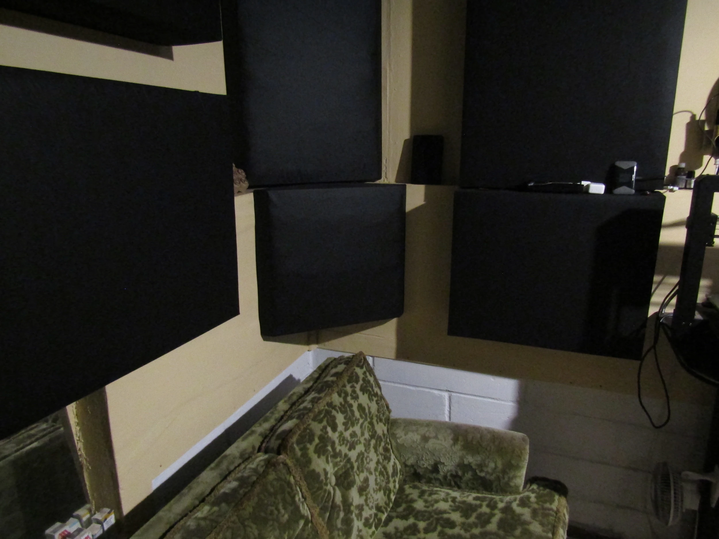 -Too close. -Potential reflection interference, etc.. Oh yeah, and the wall to the left had some weird, asymmetrical issues of its own. -A stepped portion of blocks jutting out on the right side only... -Something I had to work around when I made my own sound panels (-see below).