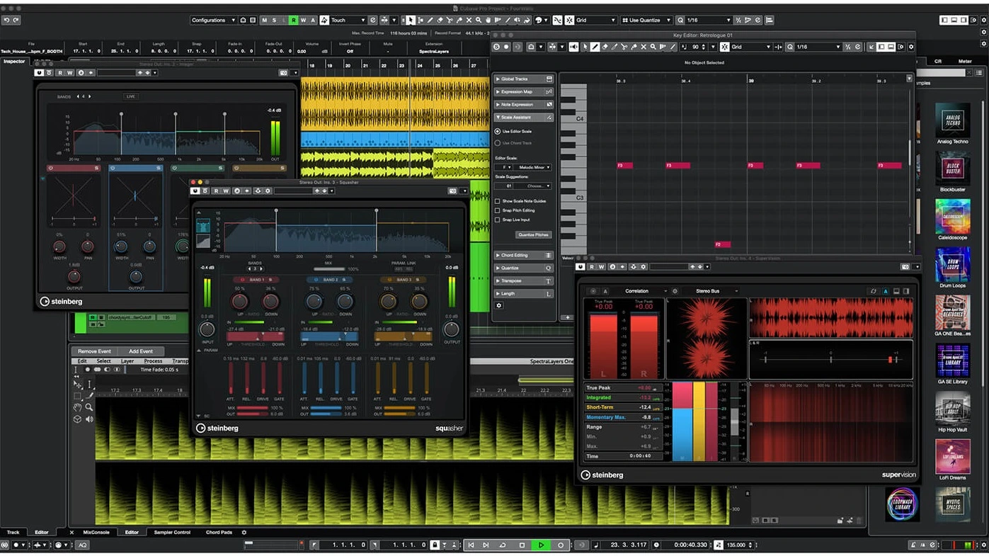 Five new plug-ins are available in the latest iteration of Cubase: SuperVision, SpectraLayers One, Imager, Squasher and Frequency 2. These all seem like great utility tools to ensure your audio is clean, punchy and professional.Frequency 2 is a precise eight-band dynamic EQ, with each band capable of being set to Dynamic mode for precise mixing. You can also have a different sidechain for each band to get really creative. SuperVision is also a great tool for checking in on frequencies, offering multimeter audio analysis. It is capable of displaying level, spectral, phase and waveform analysis with nine module slots to create your own custom modules.