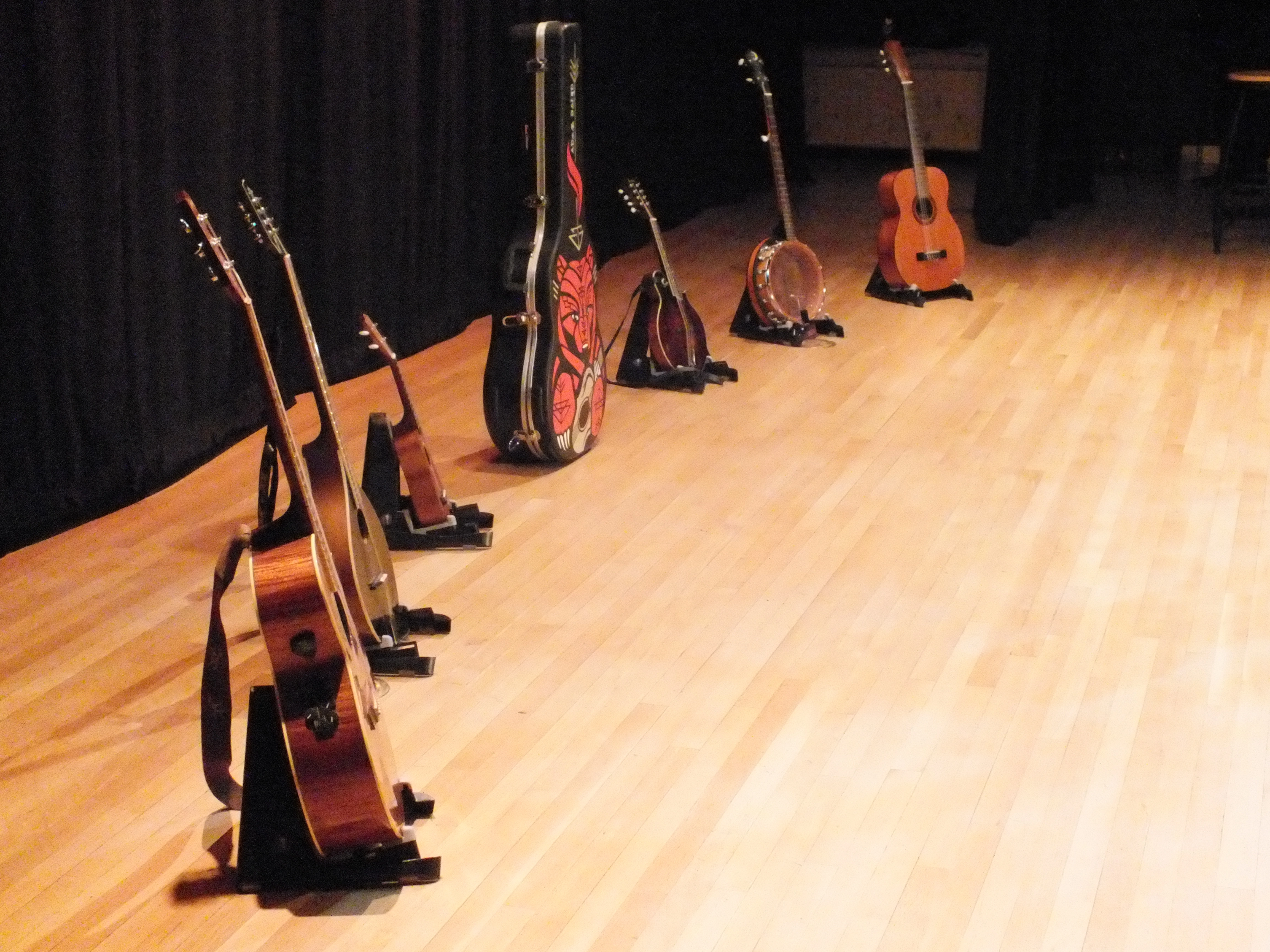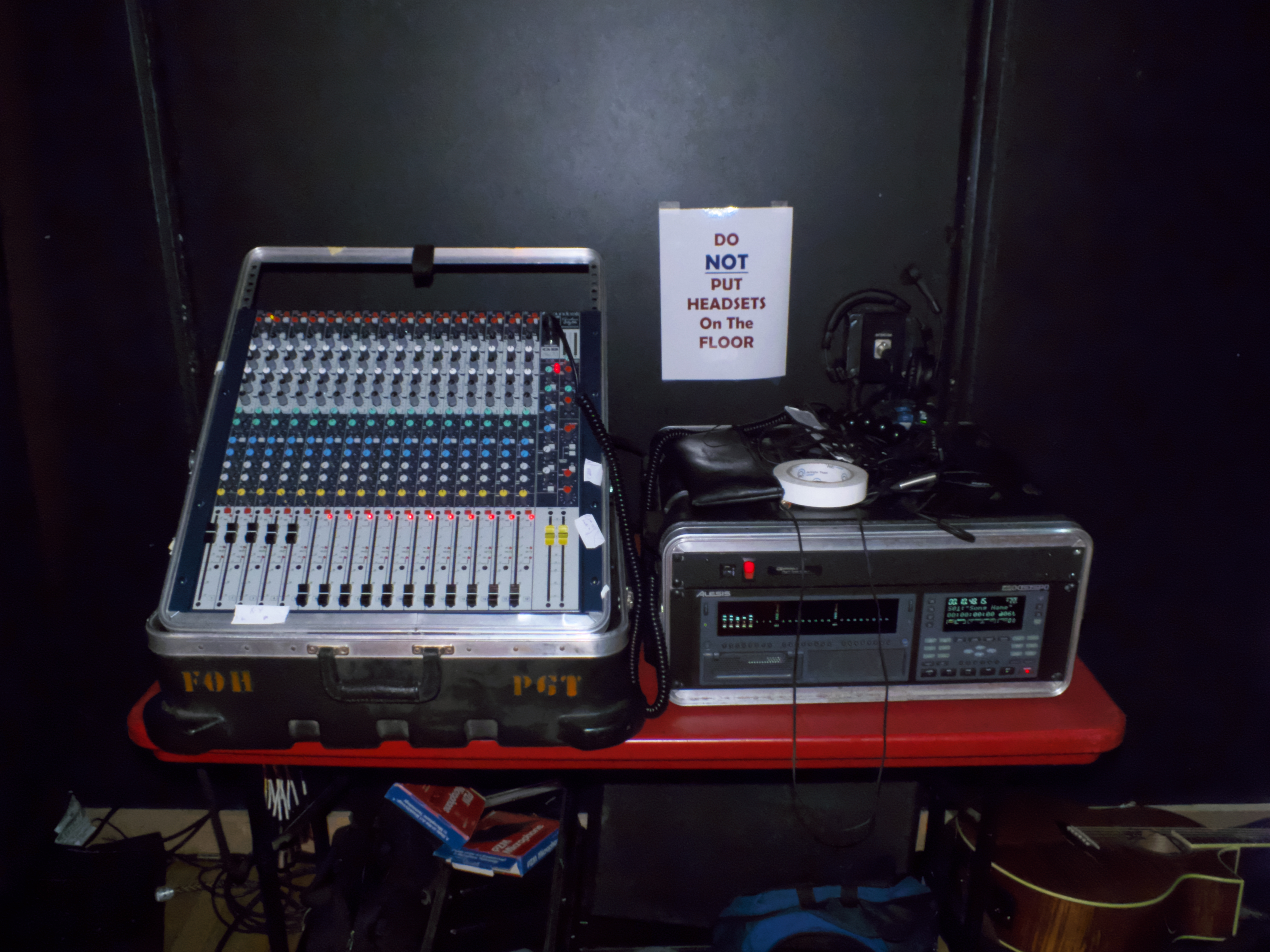 Recently I was hired to record a live concert by a solo acoustic artist. He accompanied his singing with a variety of stringed instruments using a single large diaphragm mic. I recorded five tracks: the LDC mic, my AT822 stereo mic and a pair of PZM boundary mics. I used one of my 16-channel XLR splitter snakes to split the LDC to the house system and to my Soundcraft GB2R mixer. I recorded on an Alesis HD24. Here's what it looked like.