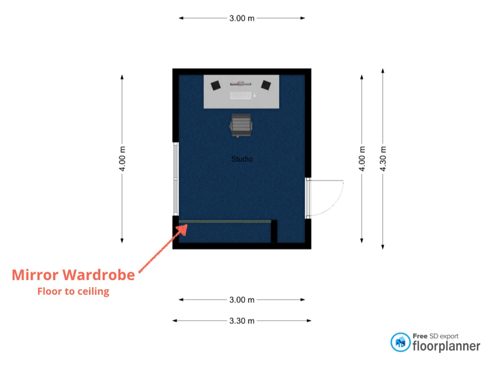 At the back wall of the room (opposite the monitors) is a built-in wardrobe with (floor to ceiling) mirror doors. I have noticed if I open one of the doors (two sliding doors, you can only open one at a time) to expose the clothing inside, it takes some of the bass out of the room.
