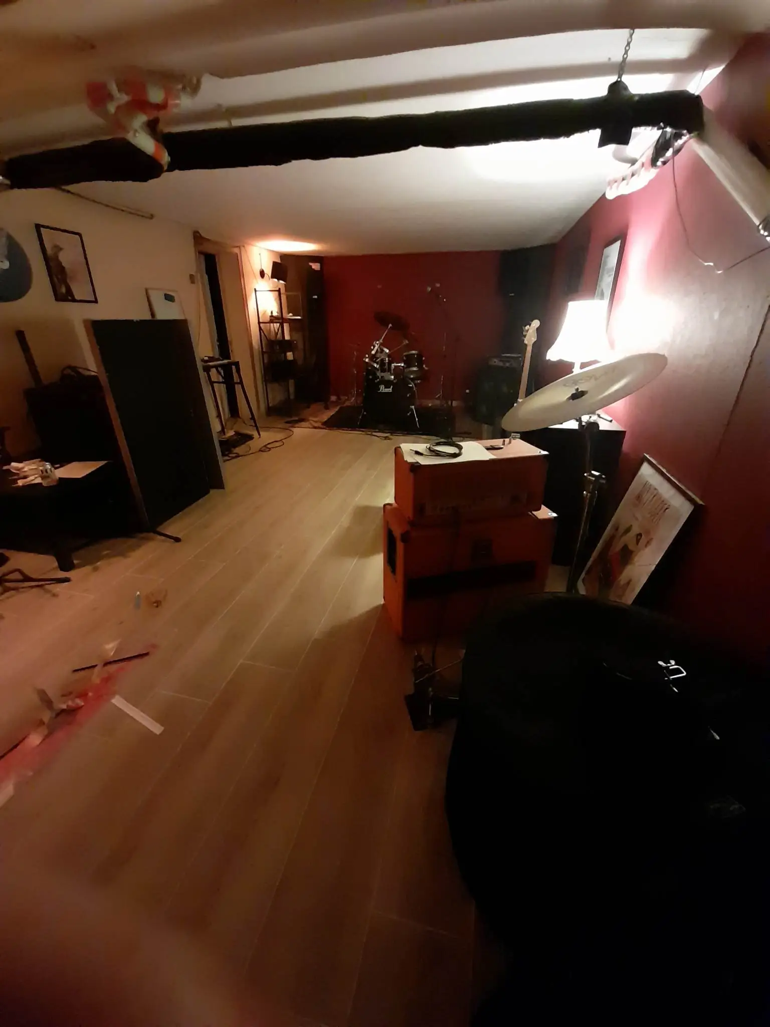 I've got a 2-room space in my basement which I transformed into a rehearsal/DIY studio. The small room is my studio setup, the big room (from which you see photos underneath) is the space where we rehearse with my bands. And where drums and guitars get recorded. The walls are all covered in OSB panels with behind it an air gap of 5cm (2 inches). The only other treatment I did was made myself some bass traps for the corners (which already made a huge difference).