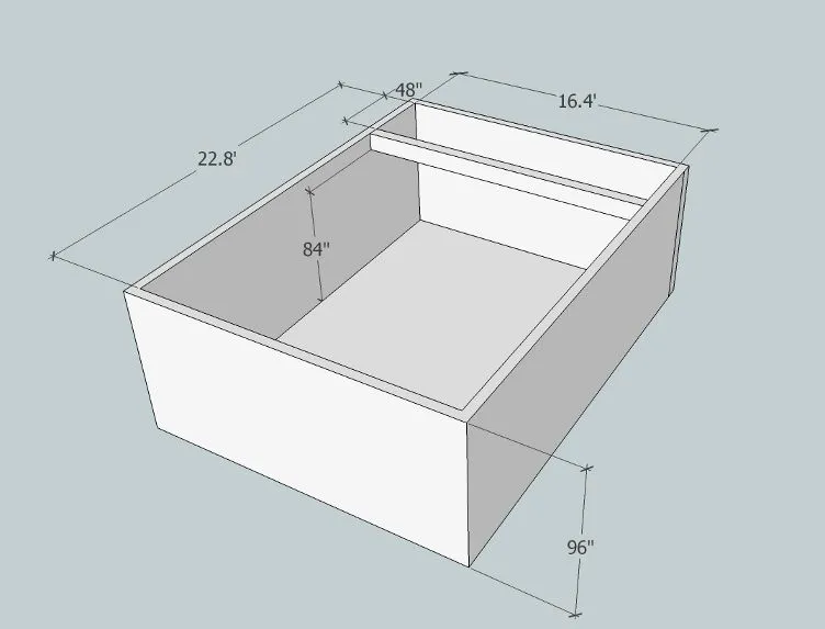 the width of the space is 16.4'(so the width cannot be more than this, it could be less since the other side wall hasn't been built)