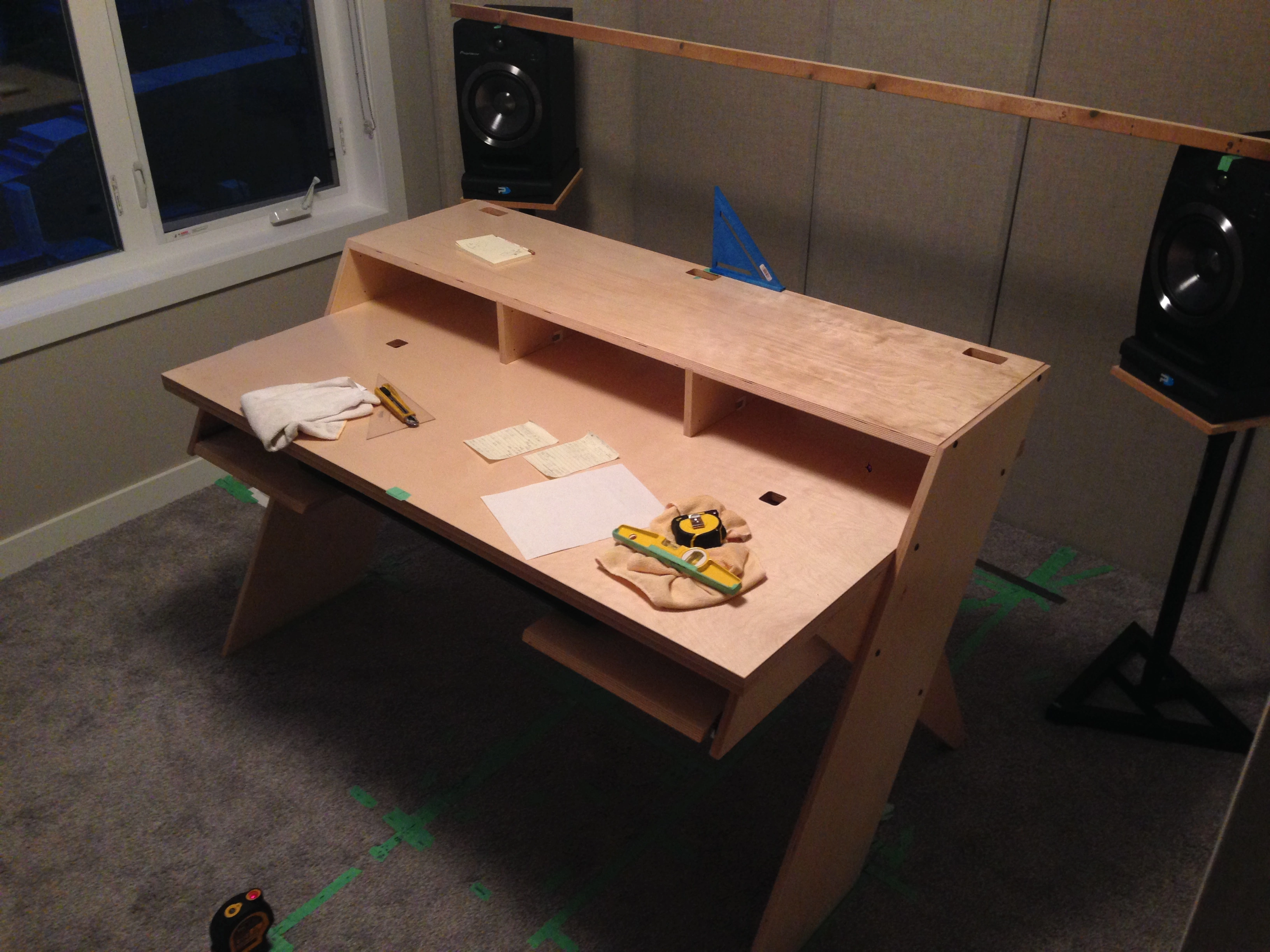 My speakers are set to the height of tweeters to my ears and the desk is slightly higher than the port height opening. I am short and sit low comfortably. Making a perfect even triangle I have played with and various mixing positions to make it work.