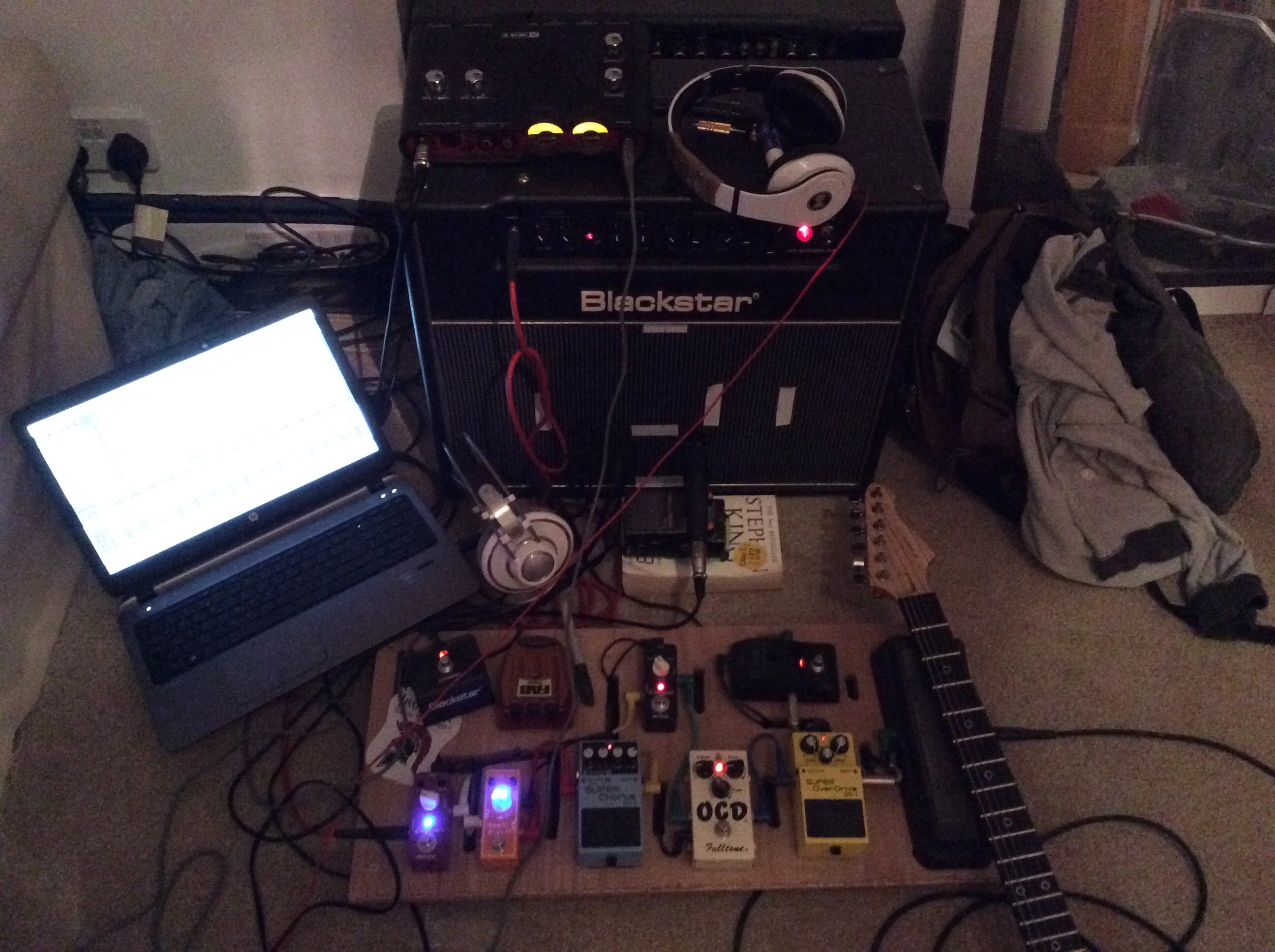 As you know I need a totally mobile set up for recording. Check out this shambolic mess... I did find a use for the Boss HM2 though.