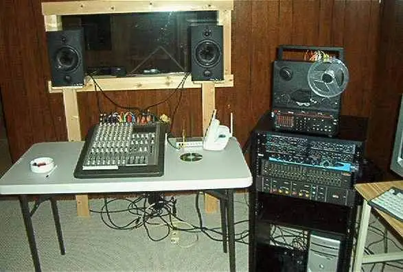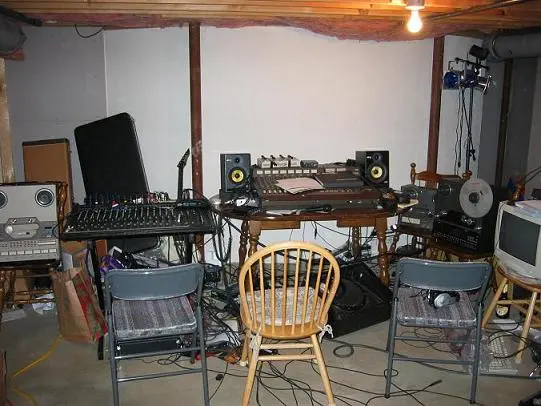 Here are a few pics of my studio... things are really messy and unorganized right now, partly because I'm waiting for a new board to come in. Right now, to get by, I'm using my Tascam 388 as a mixer in addition to a dying Peavey live board (using the 388 for inputs and the Peavey to monitor). The new board I've got coming is a Behringer MX9000.