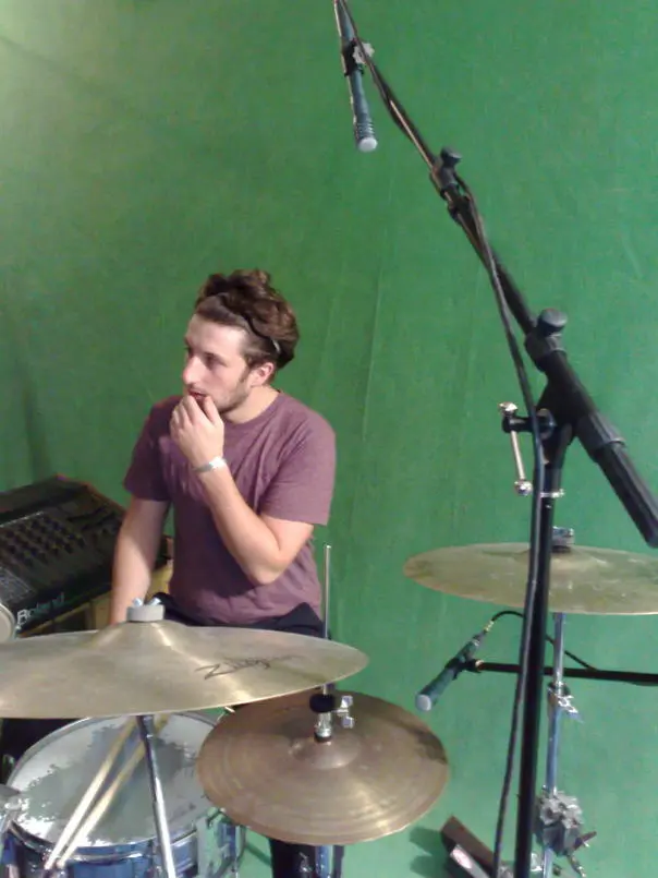 This drummer liked both cymbals on one side so used one overhead close miking the high hat and one on the two cymbals facing away from the snare and rest of kit