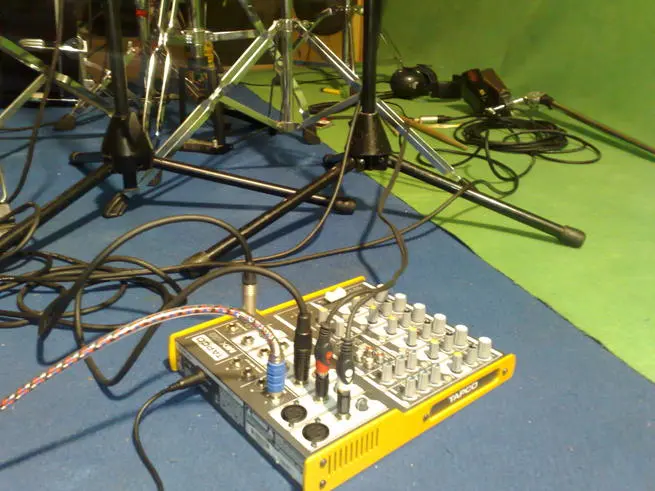 I set up the monitoring so the vocalist could hear the drums and the backing track and their own vocals but the drummer could only hear the backing track and vocals.. the drums were loud enough without going through his headphones.. Keeping the vocals separate from the backing track and rums meant I could effect the vocals with compression and mix them with the other channel..