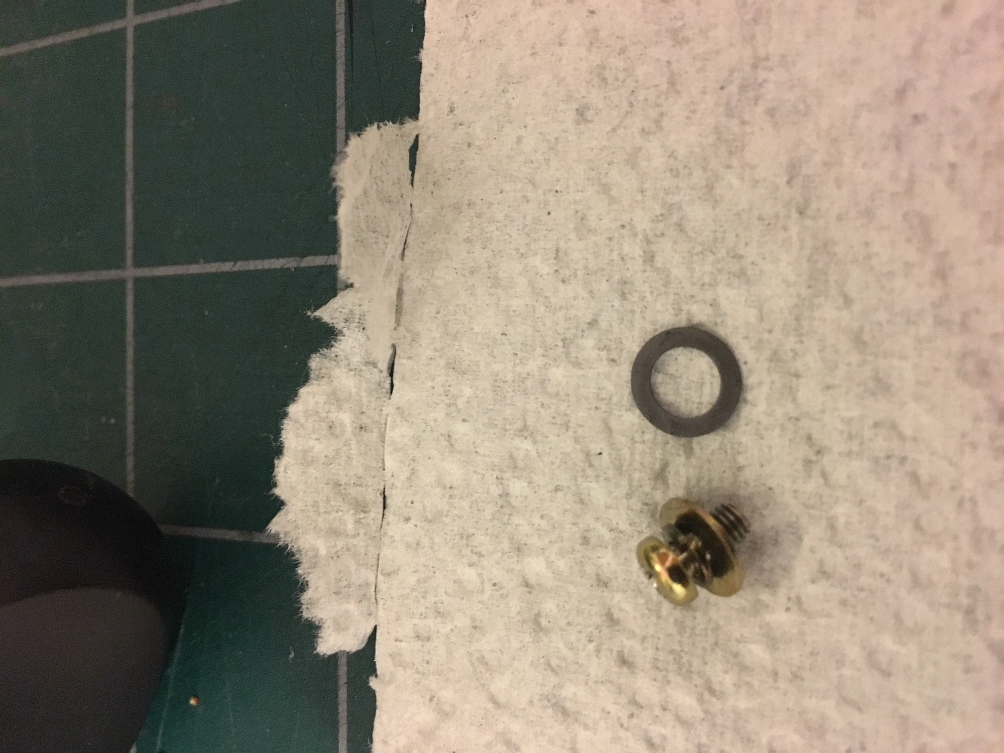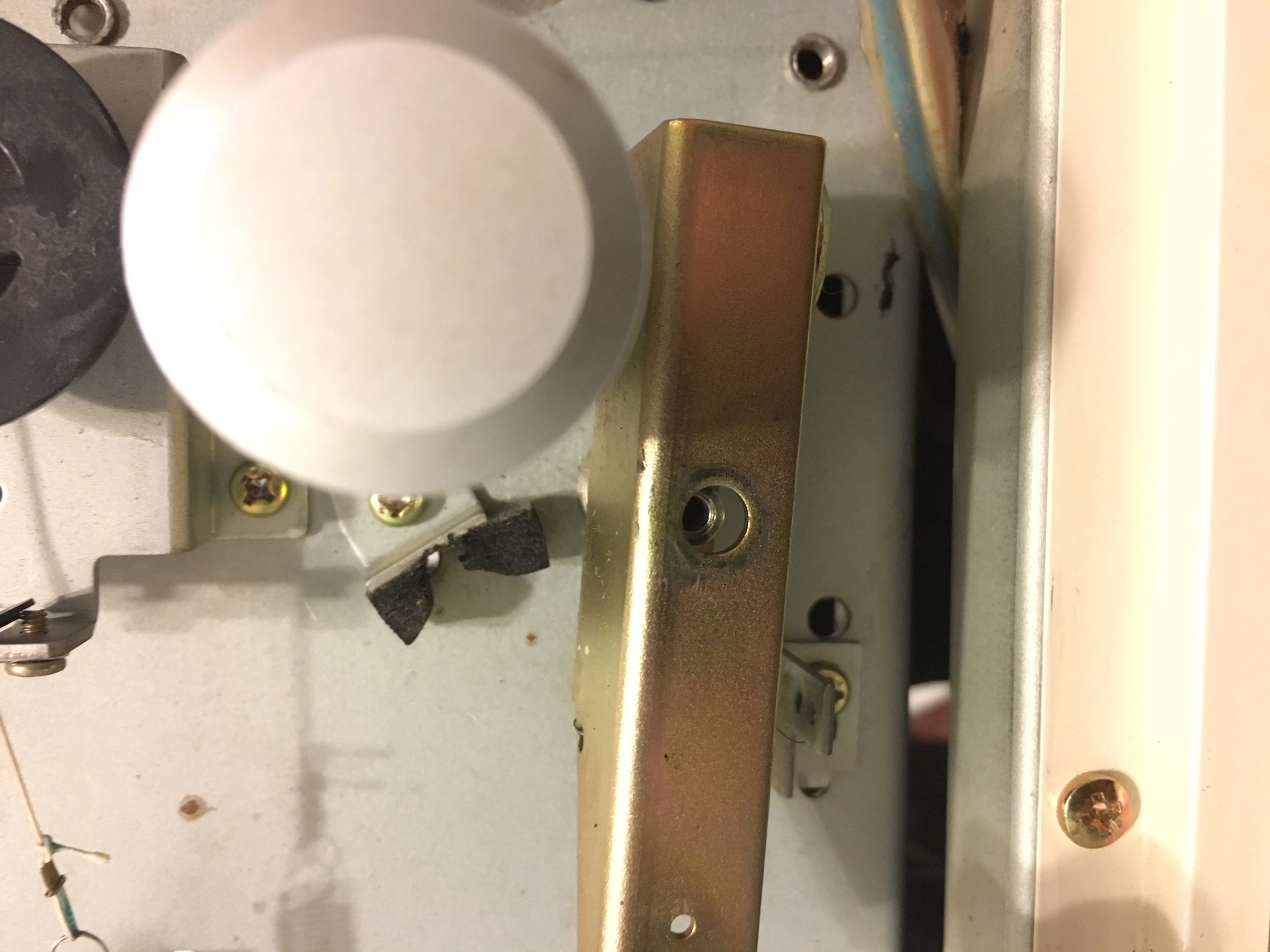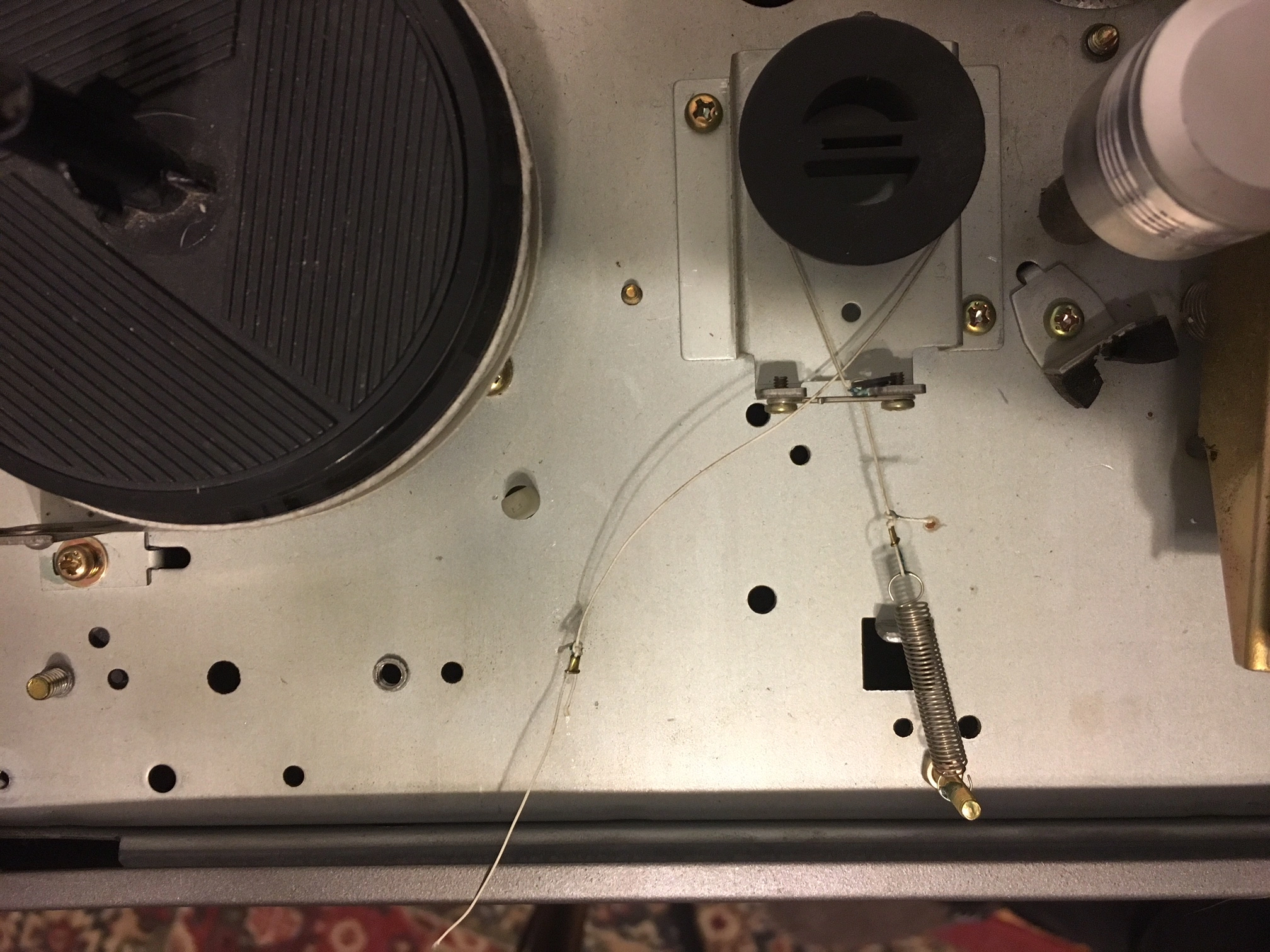 The second set of issues I actually just noticed while the machine was open. The first has to do with the small rubber buffer piece that tension arm assembly hits when it's activated (pic on the right). It's all worn away. Is there a way to put something in place to effectively serve as a shock absorber, which I think this piece is for. The second issue, which seems like it may be more important, is the string above the left tension arm (also picture on the right). It is attached to a spring at one end and not attached to anything on the other. It also appears like it had a loop at the loose end that has snapped (but I'm not certain). I think it attaches to the tension arm assembly, but I'm not certain where.