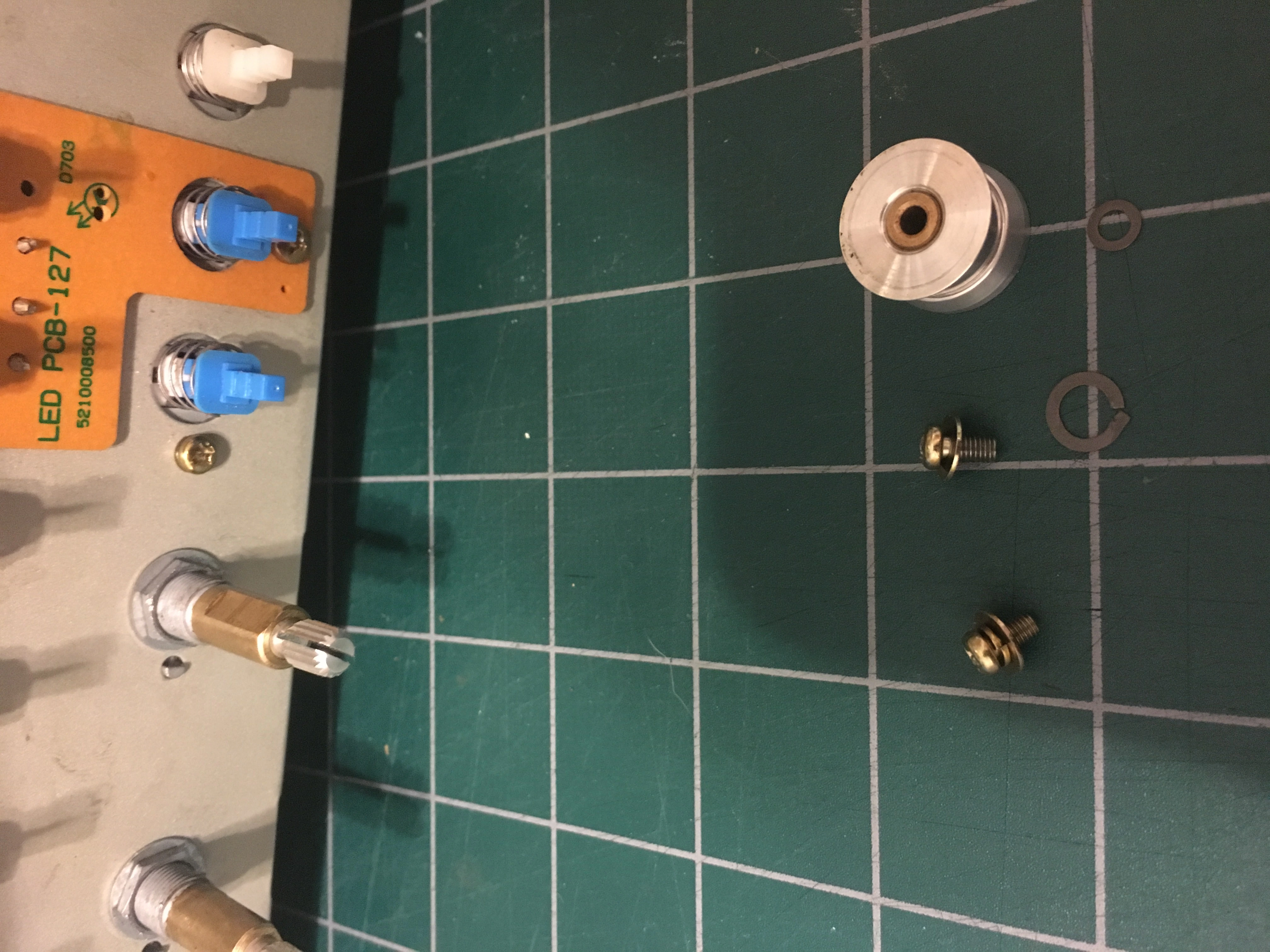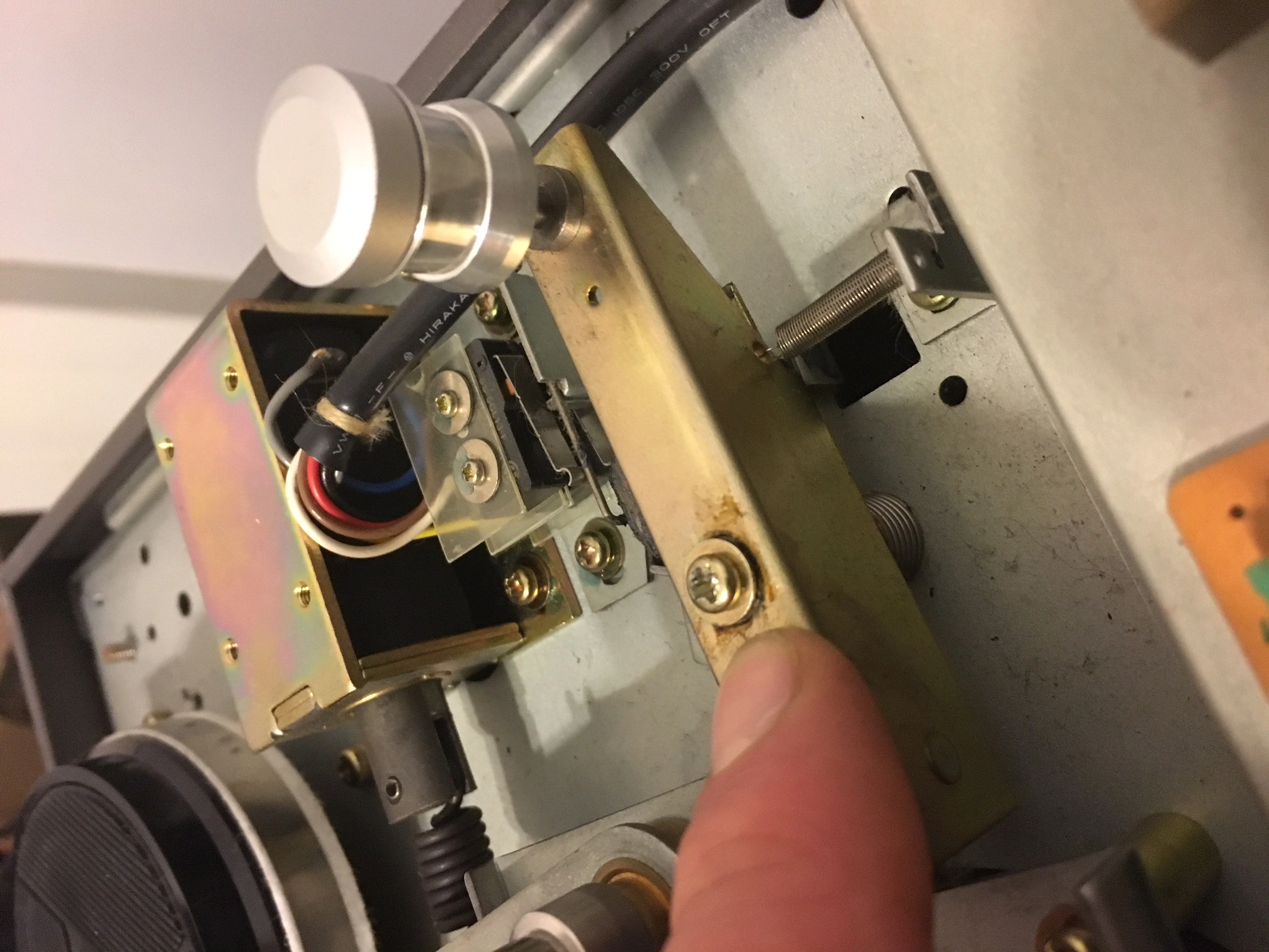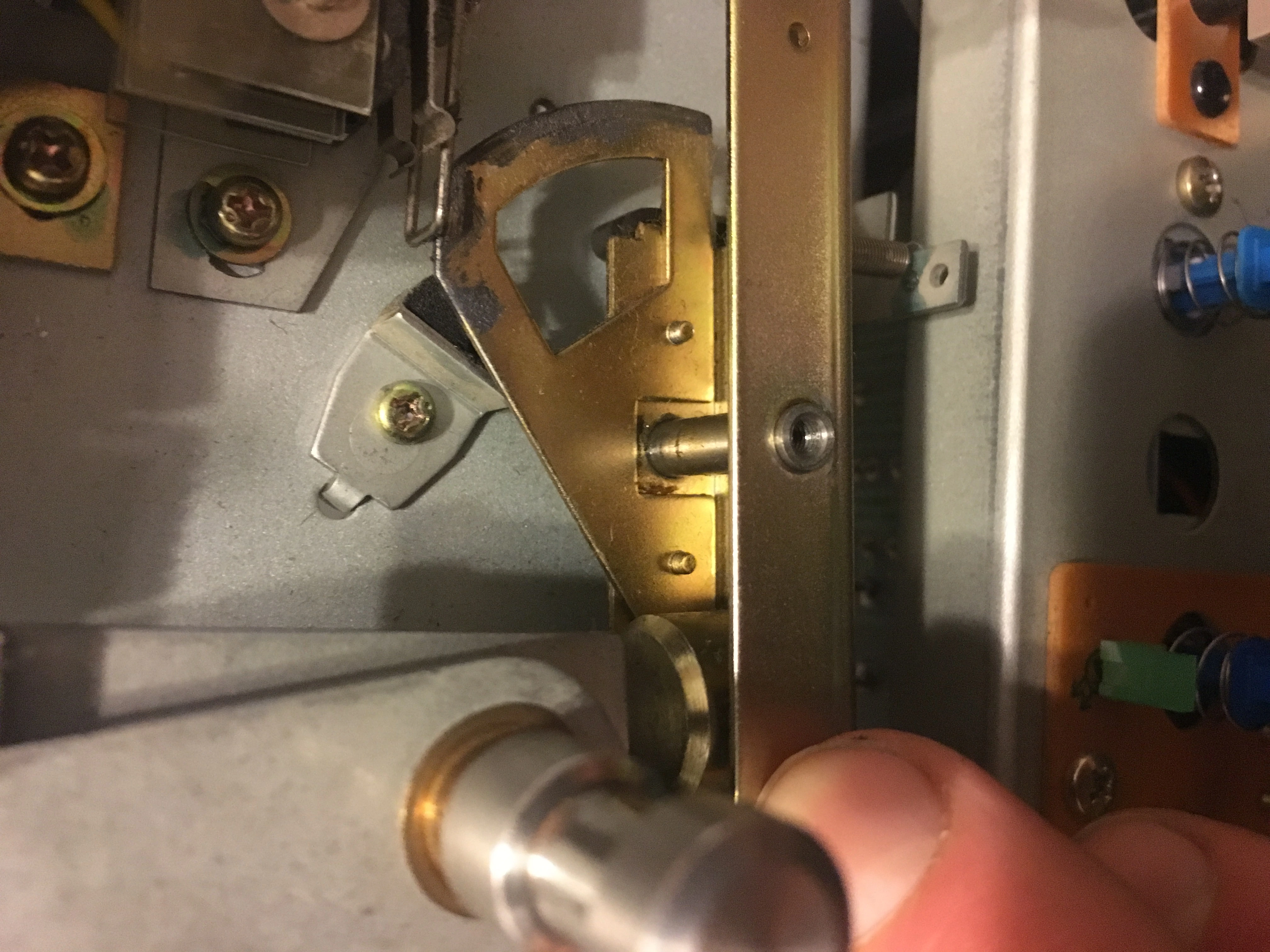 The first issue has to do with the take up reel on the right. As the tape spools it is rubbing against the inner part of the reel. I've looked inside and measured the height of the reel tables and they are measuring equally. One thing I noticed though is that the metal piece that's at the base of the right tension arm rod is missing a washer, which is present on the left tension arm assembly. When I push on the metal piece on the right it moves up and down, but it doesn't on the left. In the pic on the left (sorry for the duplicate - I can't seem to get rid of it) my finger is next to the screw with the missing washer. Sorry if my terminology is wrong! I'm trying to describe it as clearly as possible. Do you think this piece having a little play would be enough to effect the alignment? If it is, would any small washer do? I know these machines are precisely assembled.