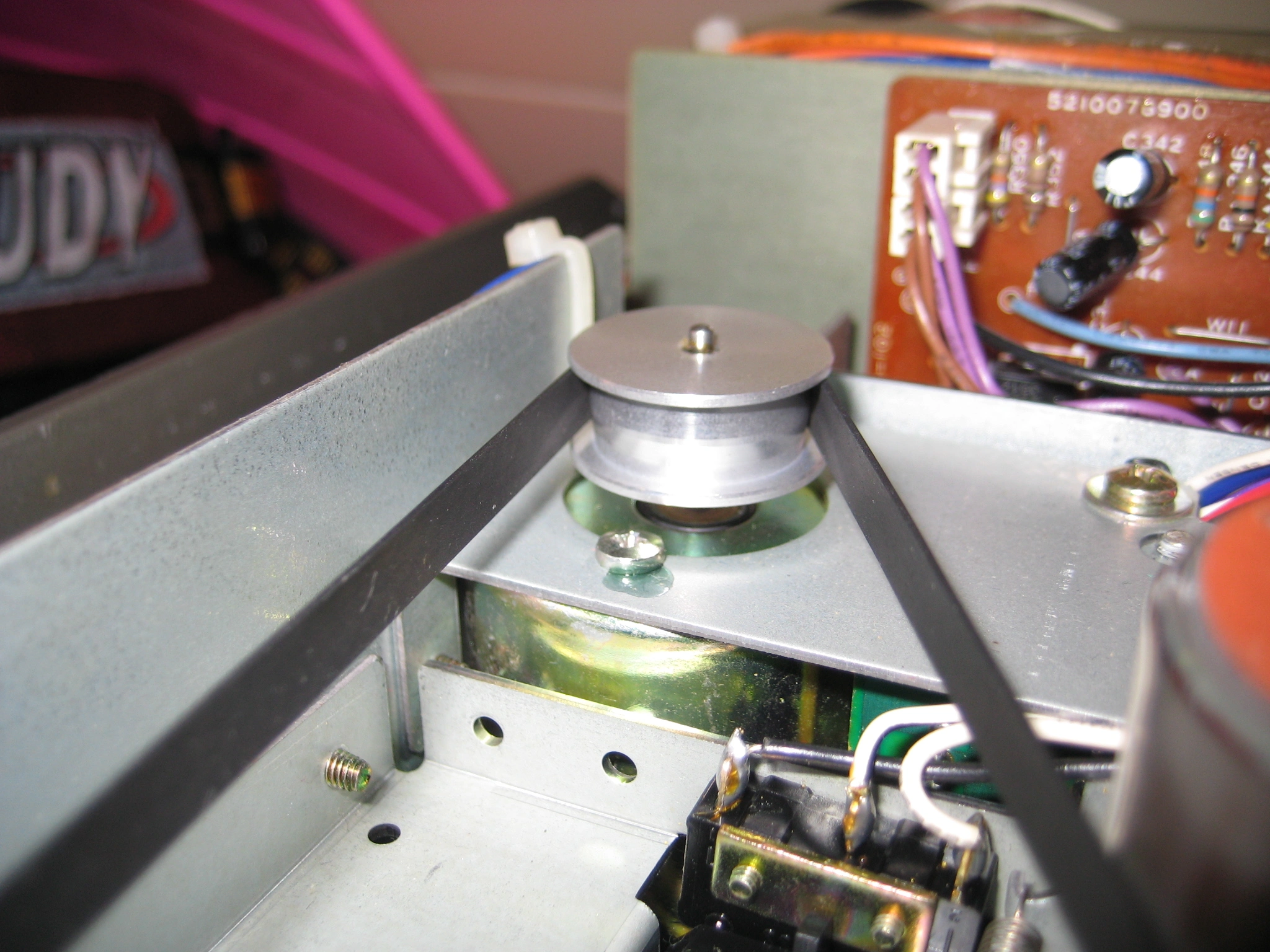 This image tries to show the capstan belt and the motor pulley