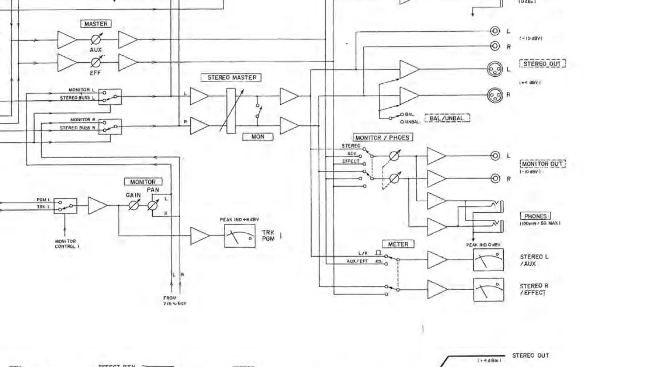 You see on the right the two headphone jacks, they have the same source, the same pair of amps for the L and R headphone channels. And if you follow it upstream you can see the headphone amp input is the same as the amp for the MONITOR OUT jacks. And furthermore when the headphones and MONITOR OUT jacks are sourced to the STEREO buss, guess what? It’s the exact same signal you should have at the balanced and unbalanced STEREO OUT jacks. So that’s the question...aside from this oddity where the two pairs of headphones were behaving differently, are you experiencing the same “everything is mono” problem at the STEREO OUT jacks as well as the MONITOR OUT jacks and the headphone jacks (at least most of the time)?