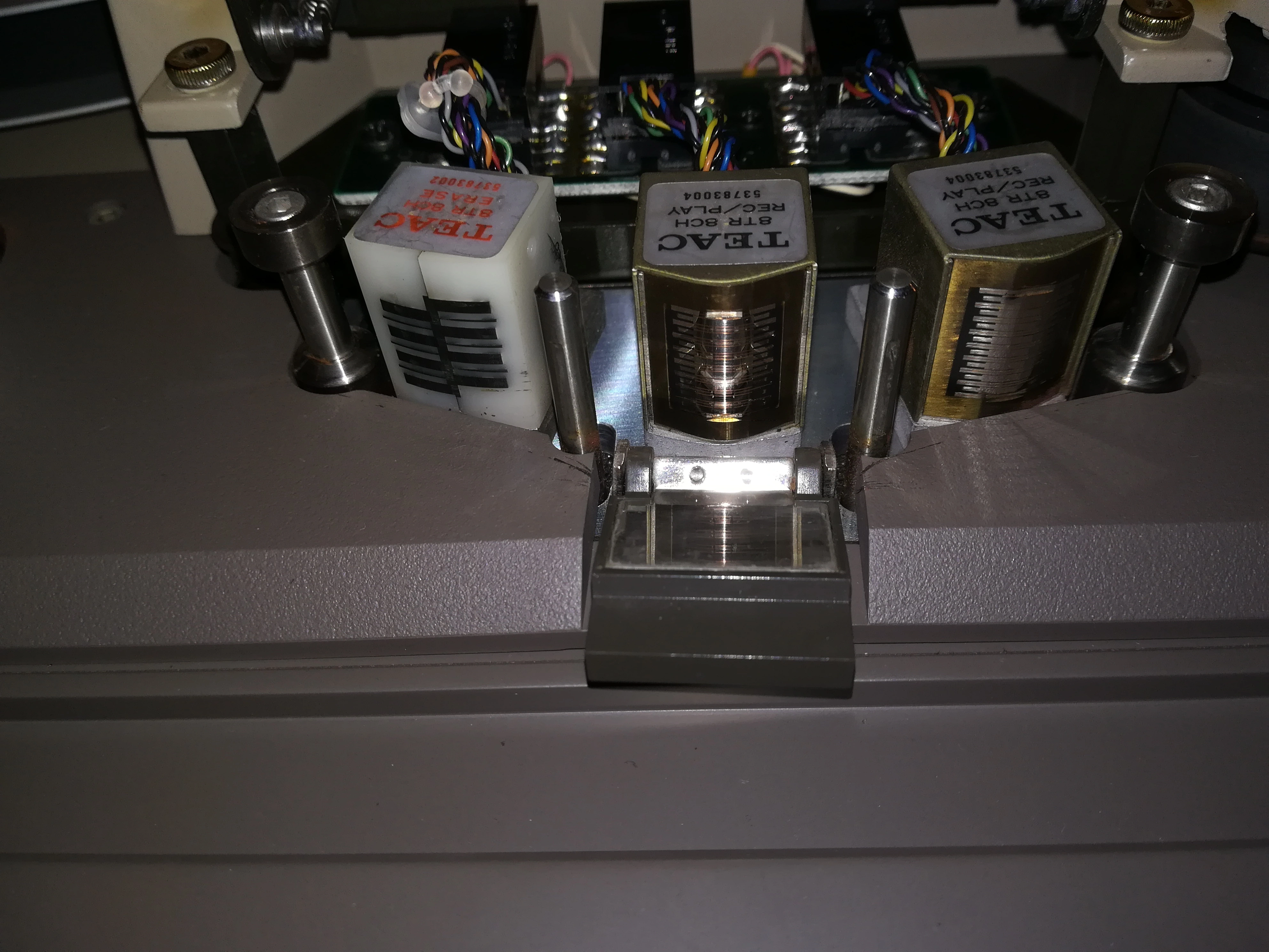 I looked at the heads with magnification and none of the heads are clean and you need to remove the gray junk as the gaps are not ever touching the tape. People use Isopropyl alcohol and it has very little effectiveness. Use Denatured or in your case you might have to use Acetone. All these heads are such that they can not work like that and the lifters are dirty too.