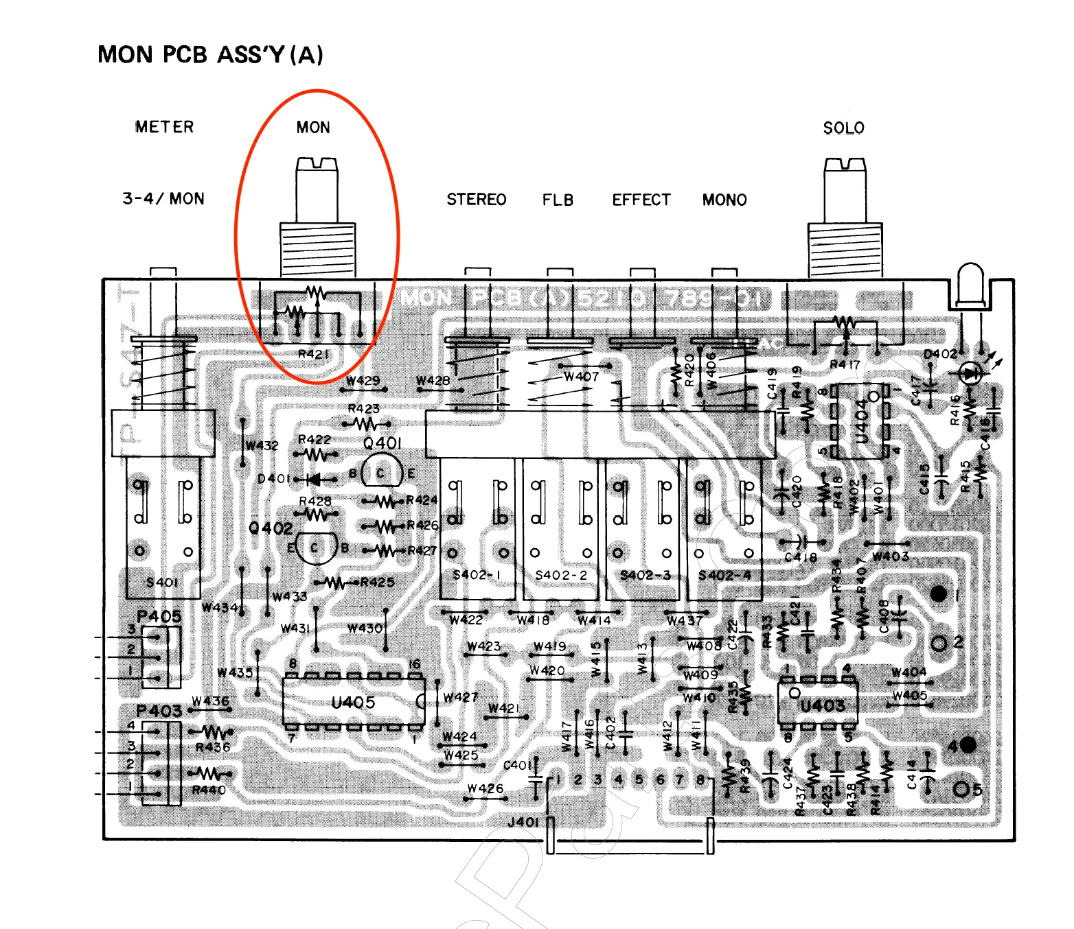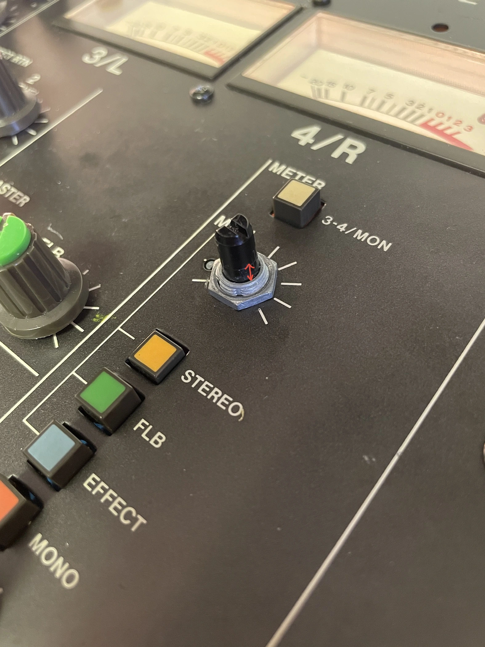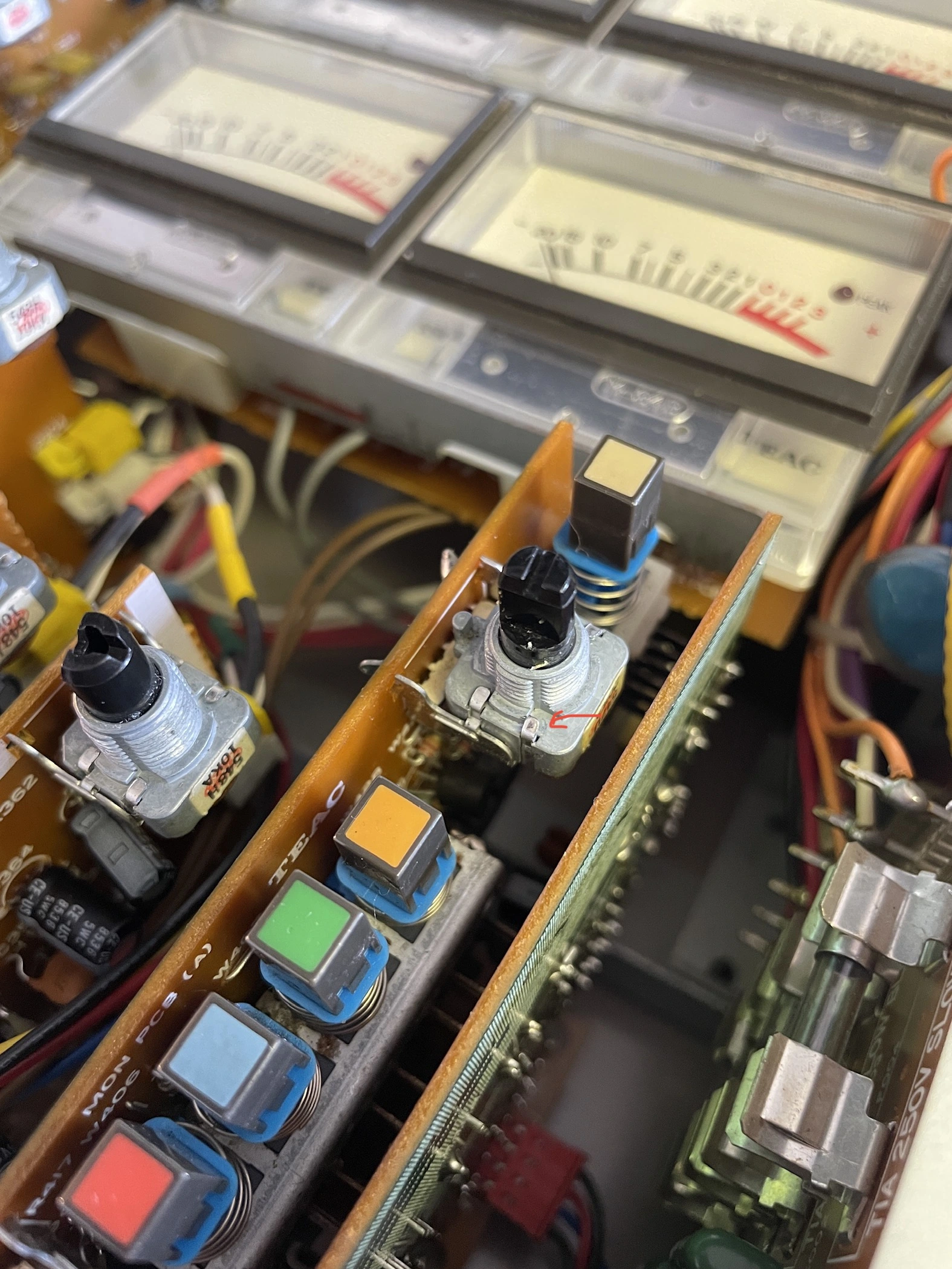 As to your meter problem, there’s that “mother” PCB that goes across the bottom of the PCBs in the master section. Those connections are notorious for getting oxidized or developing cracked solder joints. You could try gently manipulating those connections where they plug into the MONITOR PCB A & B boards…the one with the monitor level pot and meter source select switch on it, and then there’s the one right next to it to which the other side of the switches are mounted. On the second board the black two pin connector is what goes to the meters. Exercise that. Look for compromised solder joints where the pins of the connector on the board solder to the board. And then where both of those boards connect to the mother PCB. It’s also possible this set of connections where the MONITOR PCB array connect to the MOTHER PCB is the cause of your headphone issue. Run some audio to the headphones and listen while gently manipulating the connections of the MONITOR PCBs to the MOTHER PCB. If you get intermittent signal in both sides of the headphones and also look at the meter performance…if you can get intermittent performance in the meters by gently manipulating the MOTHER PCB connections you may just need to carefully re-seat the MOTHER PCB, or it may need solder joints re-flowed, but it’s totally fixable. It’s also possible the U405 needs replaced for the headphone issue, but I suspect that’s not the case. But those 4000 series logic chips are known to go bad in a number of period Teac products because they chose to power the circuit at the maximum level the chips can handle, which shortens their service life.