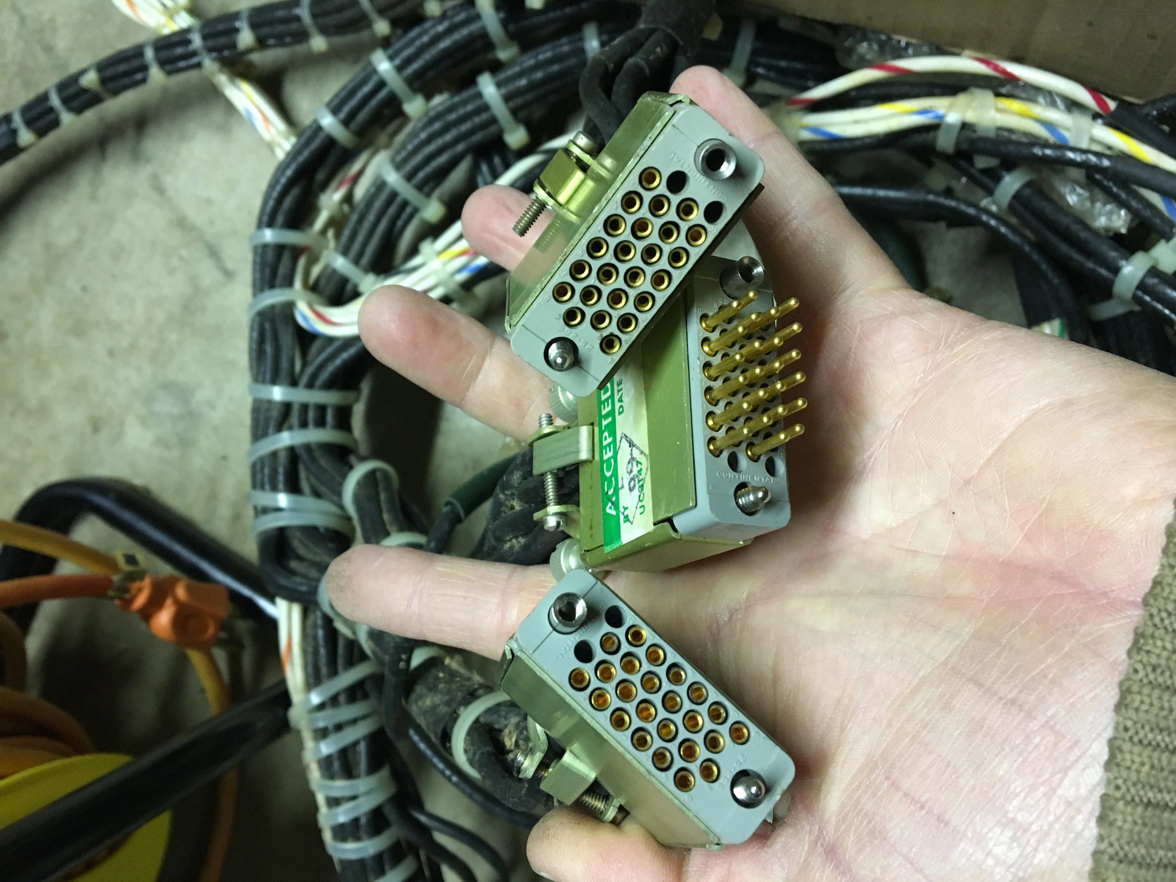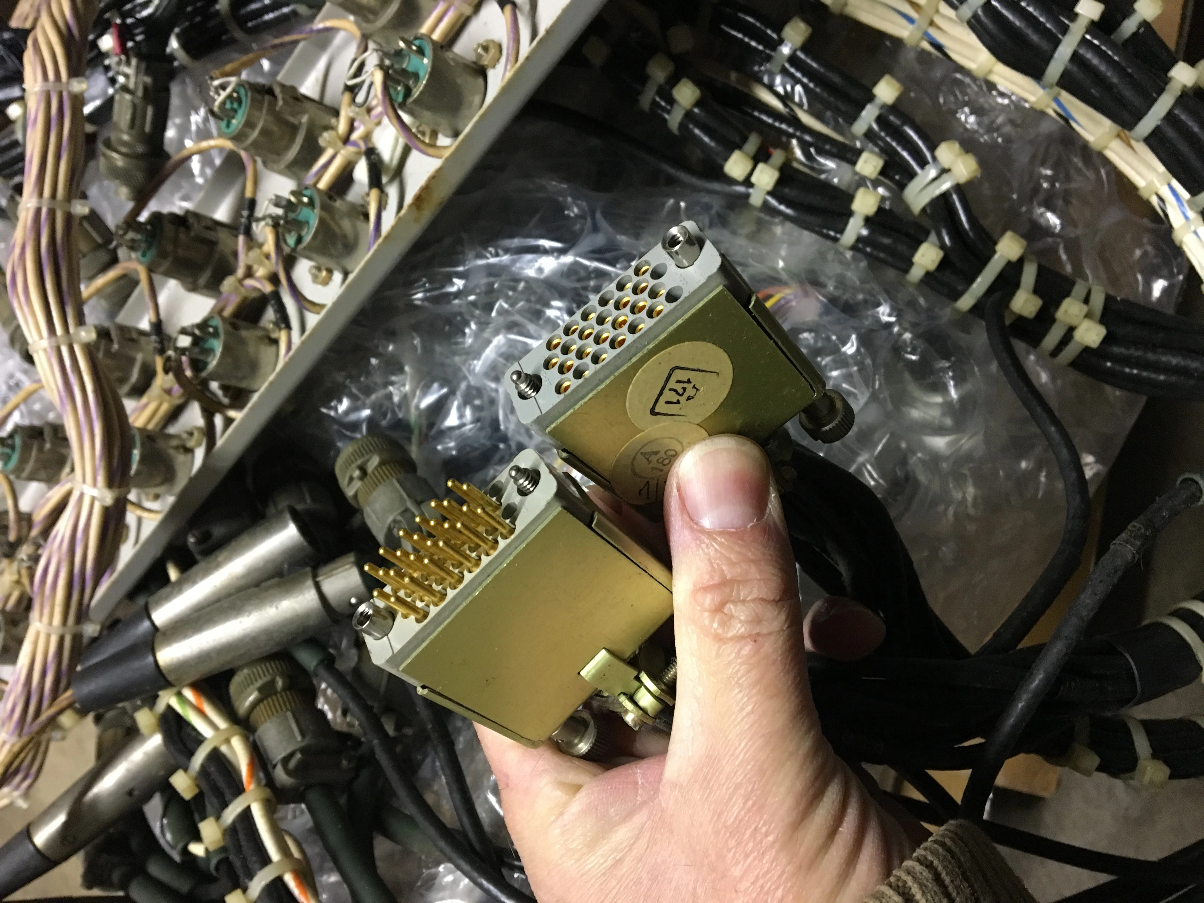 I will want to recap it, I need to look at the +/-15V supply for possible improvements in the noise floor with the regulator IC and the output transistors, and I’m also in the last day wondering about the possible wisdom of incorporating a soft-start circuit because the filter capacitance between the power supply and all the 100uF filter caps throughout the console is over 80,000uF. The other thing that will need to be done is dealing with the interface connector on the supply for the umbilical to the console. The PS-3500, like many other Teac/Tascam power supplies uses interconnects made by Hirose: Sumicon 1600 series parts. These are near impossible to find…long since discontinued. I’m confident that, with time and patience, I could find the parts. The PS-3500 uses a 28-pin connector, the 1628. I’d need a male cable mount connector and the associated hood. I did a quick search with no results. It wouldn’t be easy. Maybe 10 years ago I did a global search for 20-pin parts for my M-520 I had at the time. I finally tracked down some old stock stores at Canford UK. It wasn’t cheap with the international shipping, but I bought them out. They don’t happen to have any 28-pin parts. So, again, I’m sure with time and patience I could find what I need, but then I started thinking of other options, like DSUB connectors, and then it hit me: I’ve got quite a decent collection of vintage mil-spec Winchester and Cannon multipin circular and rectangular connectors thanks to a bunch of spare Ampex wiring harnesses. After a few minutes poking around in the shop I found parts that I’m confident will fit, and will do a *very* nice job providing interconnect long after I’m dead and gone. These connectors are extremely rugged and high quality…gold plated contacts, etc. So there’s that modification to do. And then there’s the +/-35V supply…