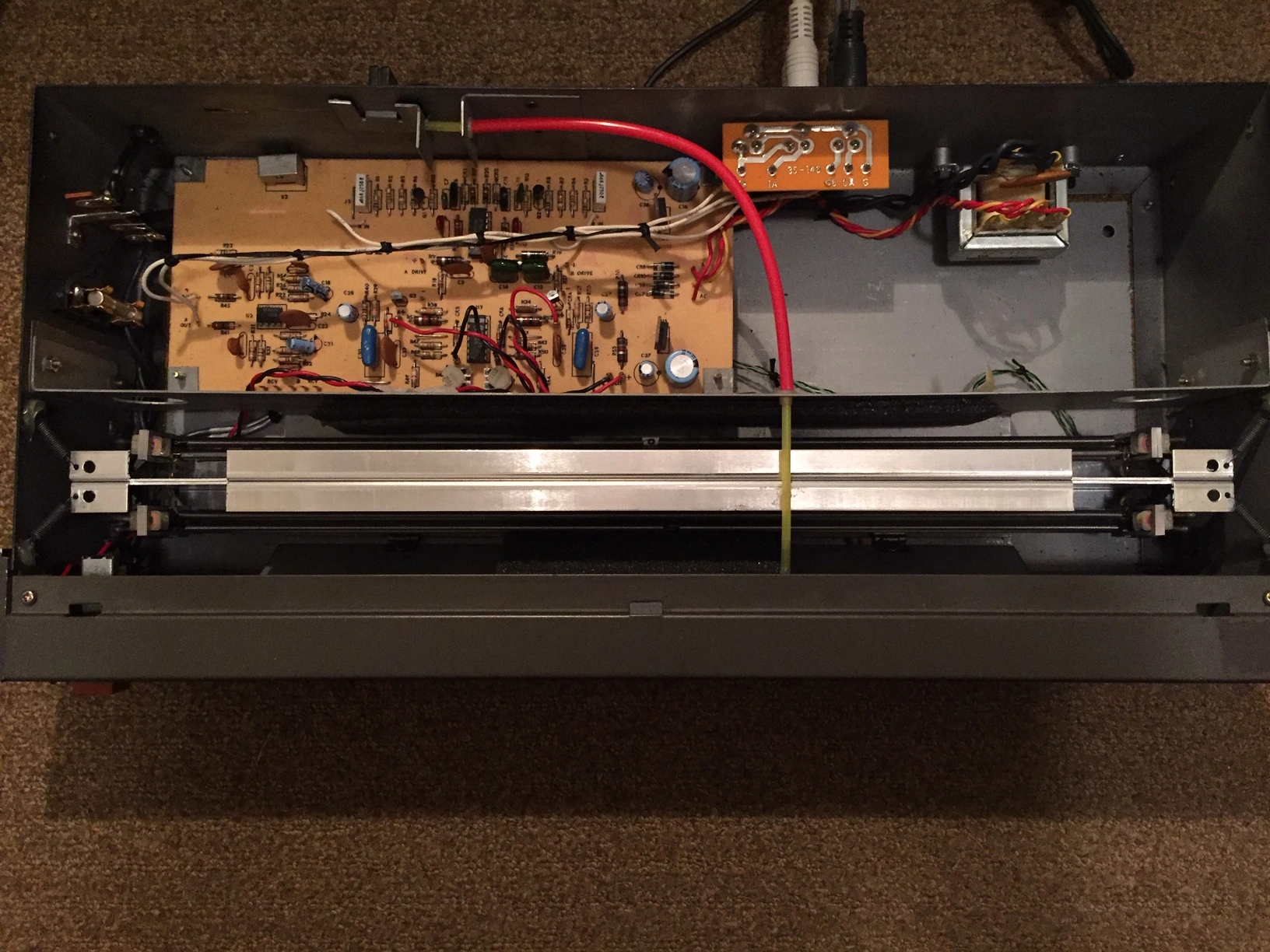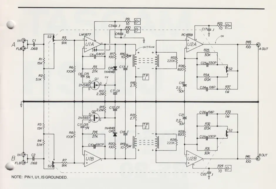-- Opened the unit while it is feeding back. When I hold my finger down on the channel A springs, it reduces the noise, but the oscillation won't stop; and I still feel a charge moving through the springs (with no signal being sent from the console). Holding down the springs on channel B has no effect, just continued feedback