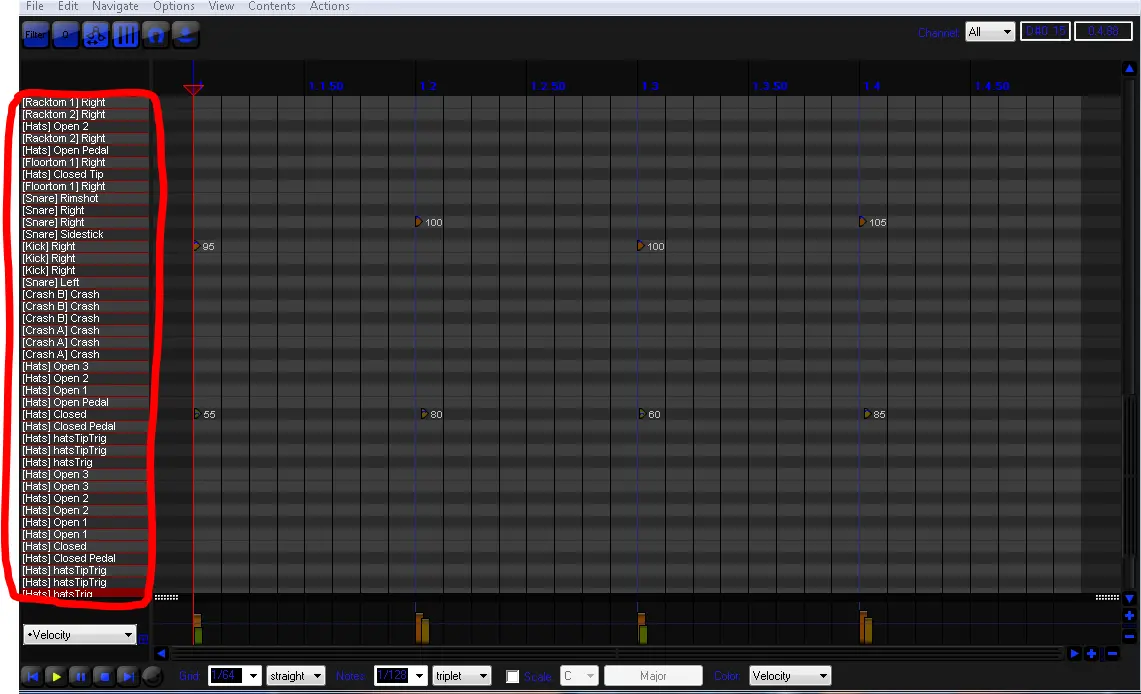 Here's a screenshot of the midi editor in Reaper, using the first EZ Pop/Rock groove/beat I came to. I outlined the hits/articulations on the left so you'd see what I'm talking about......Without loading a drum map, the names will be blank, making you guess what hits are where. Lots of ways to edit/move/change each hit, IE: kick is usually midi note 36, you could change all those to 38 (snare) if you wanted......