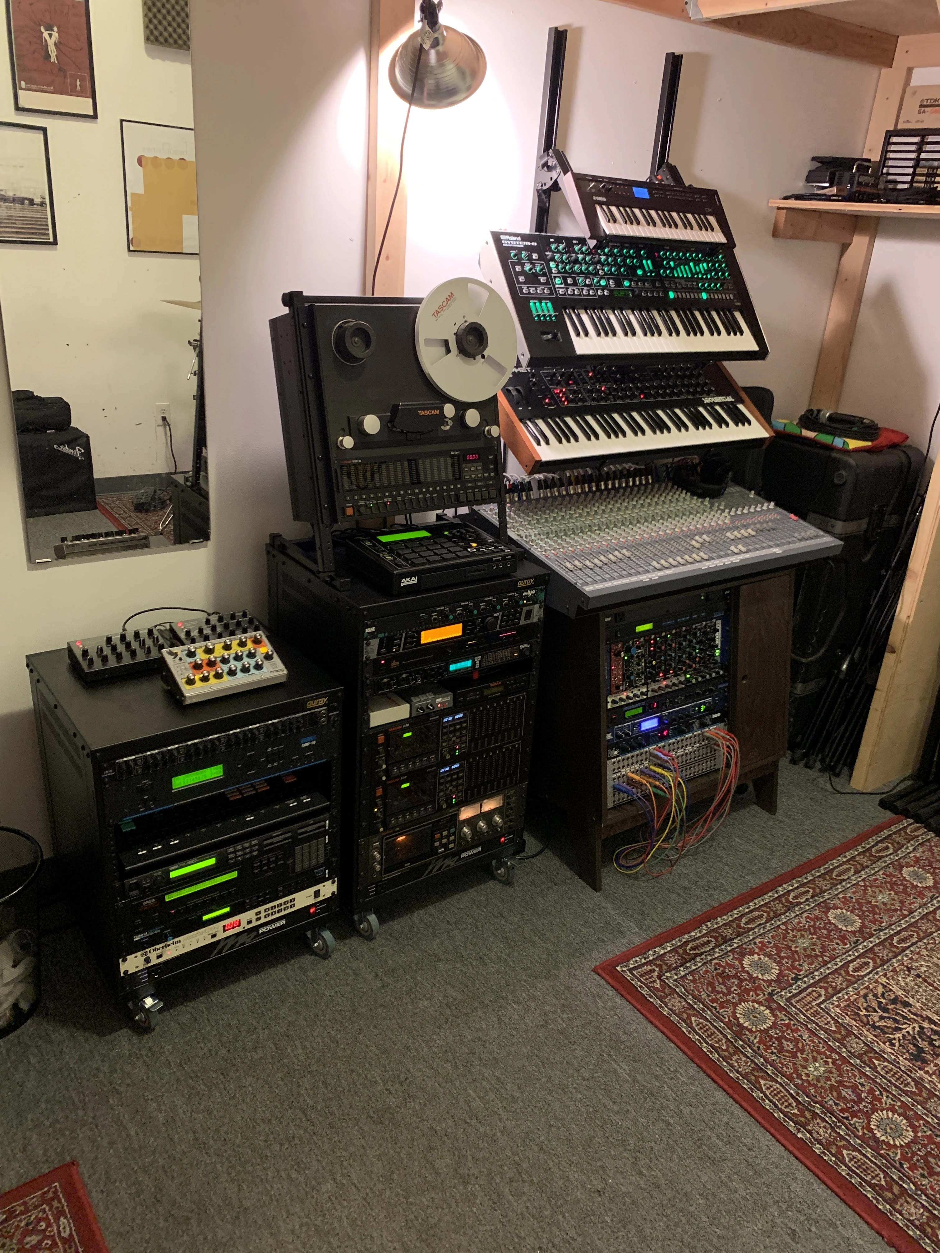 Over the last three years I've been assembling something of a lo-fi tape studio in my Brooklyn rehearsal space. I purchased two Tascam 238 decks and an M-1600 24 track mixer, along with an ATS-500 I acquired through a serendipitous Reverb email exchange (to synchronize them). I've been able to record and mix some pretty fun tunes on the setup (photo attached).
