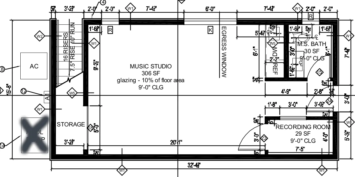 Attached is a floor plan with dimensions of a detached studio I am moving into early next year. I have 2 layers of interior drywall (with green glue in between, attached to 2x4 framing, batt insulation, then a stucco exterior on the N, S, and West interior walls. The isolation room also has the double drywall on the interior. I'm hoping this keeps the neighbors to the west and south happy. Their closest walls are probably >30 ft away, but our property sits above theirs so our block fencing doesn't help. I have yet to get my bass amp and drum set in the room to test, and will add another drywall layer if necessary. That's a running concern I hope we have alleviated, so may circle back on that later.