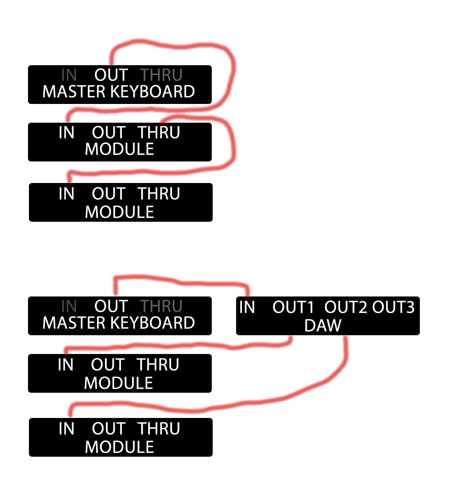 Synths with keyboard - this is where we start to get the confusion - firstly, you could use this as a master keyboard - but because it is sending data, you use the MIDI out. The synth will play it's onboard sounds when you press keys, and that also goes to the next module if you have one. However, if your output is going to a DAW, then the problems start. That DAW has to speak to the other devices. Master keyboards mess this all up, because rarely do they have an input. A synth, used as a master keyboard DOES have a MIDI in, so the DAW could squirt the replay audio in that socket.