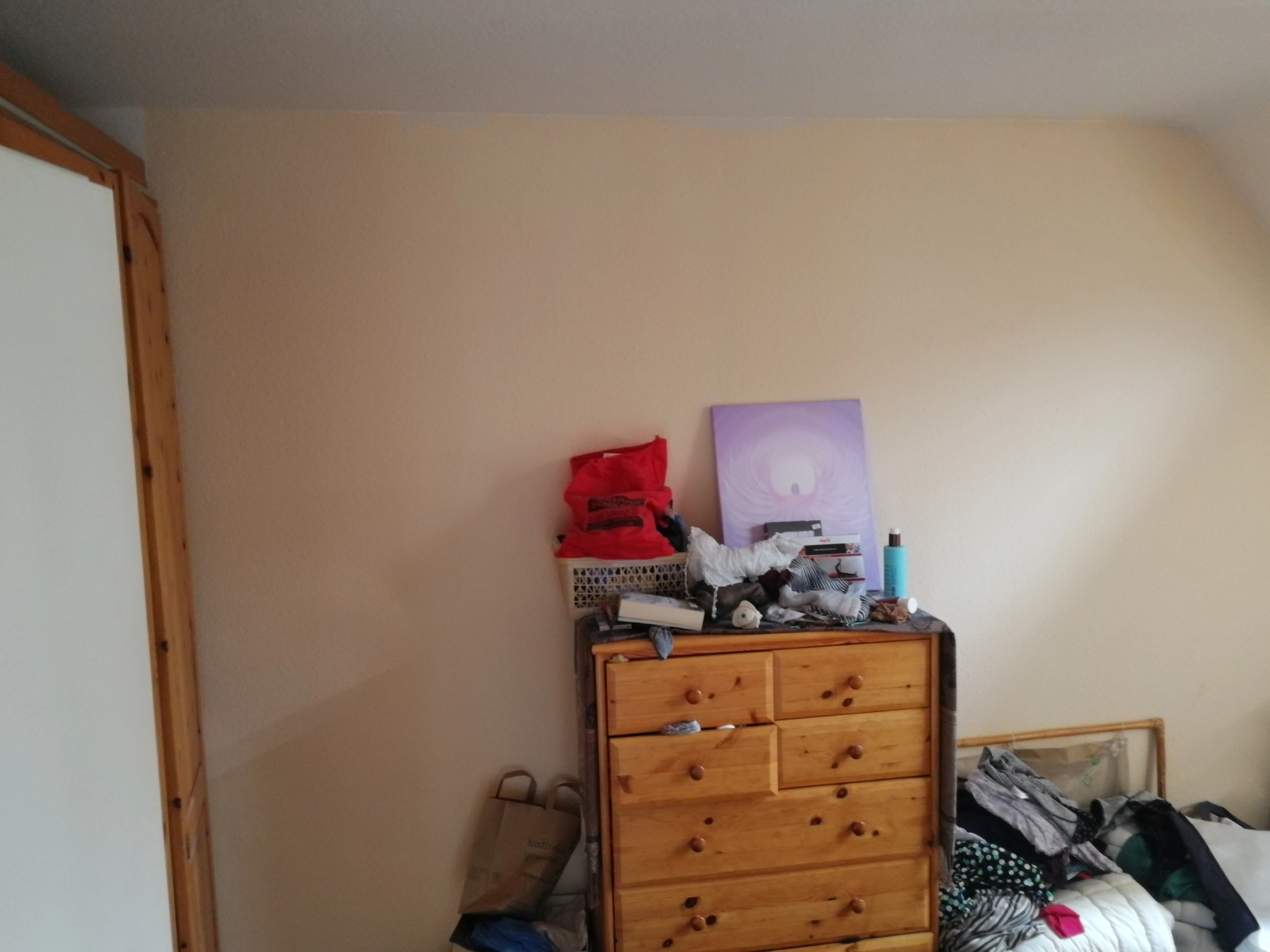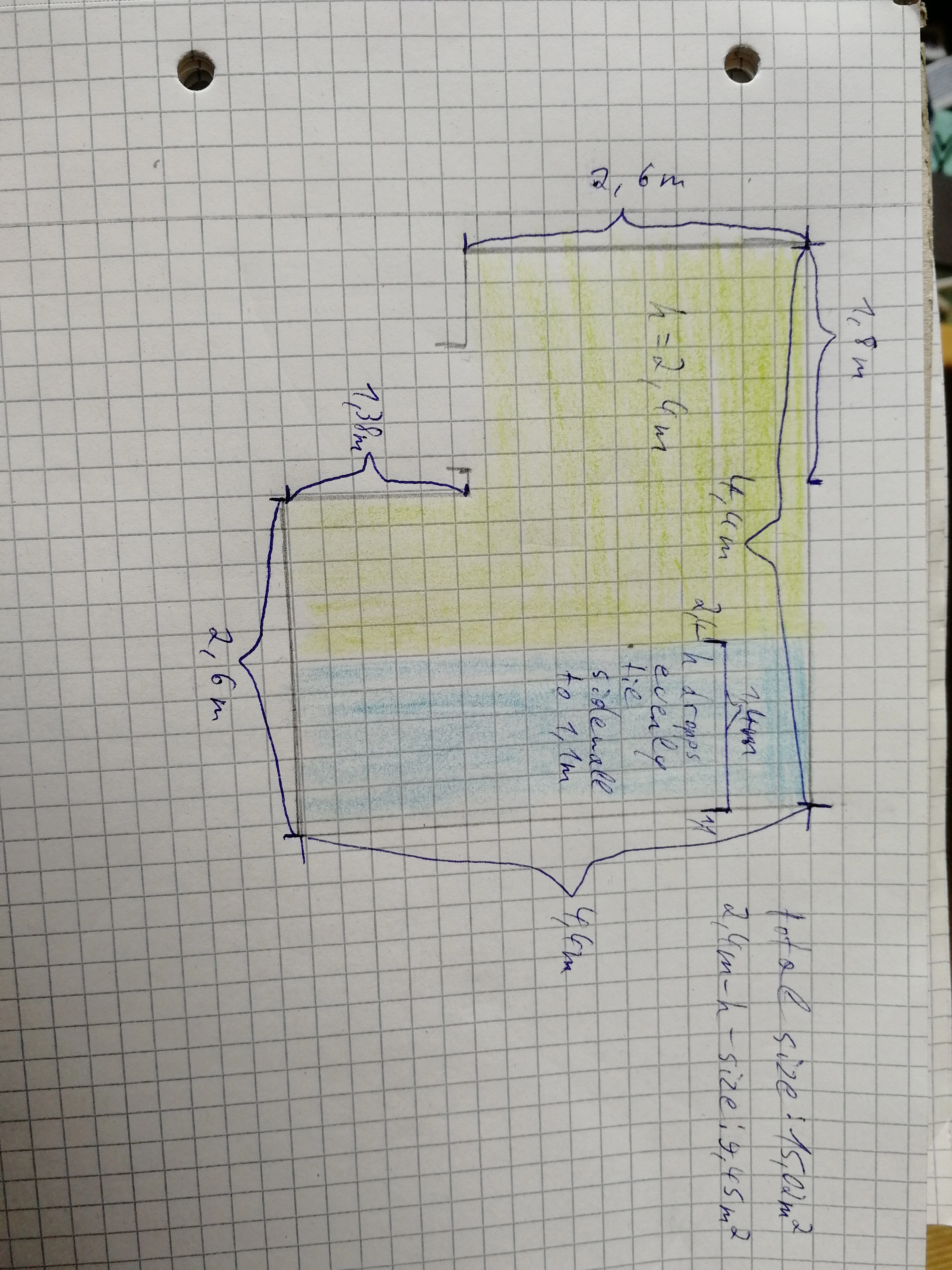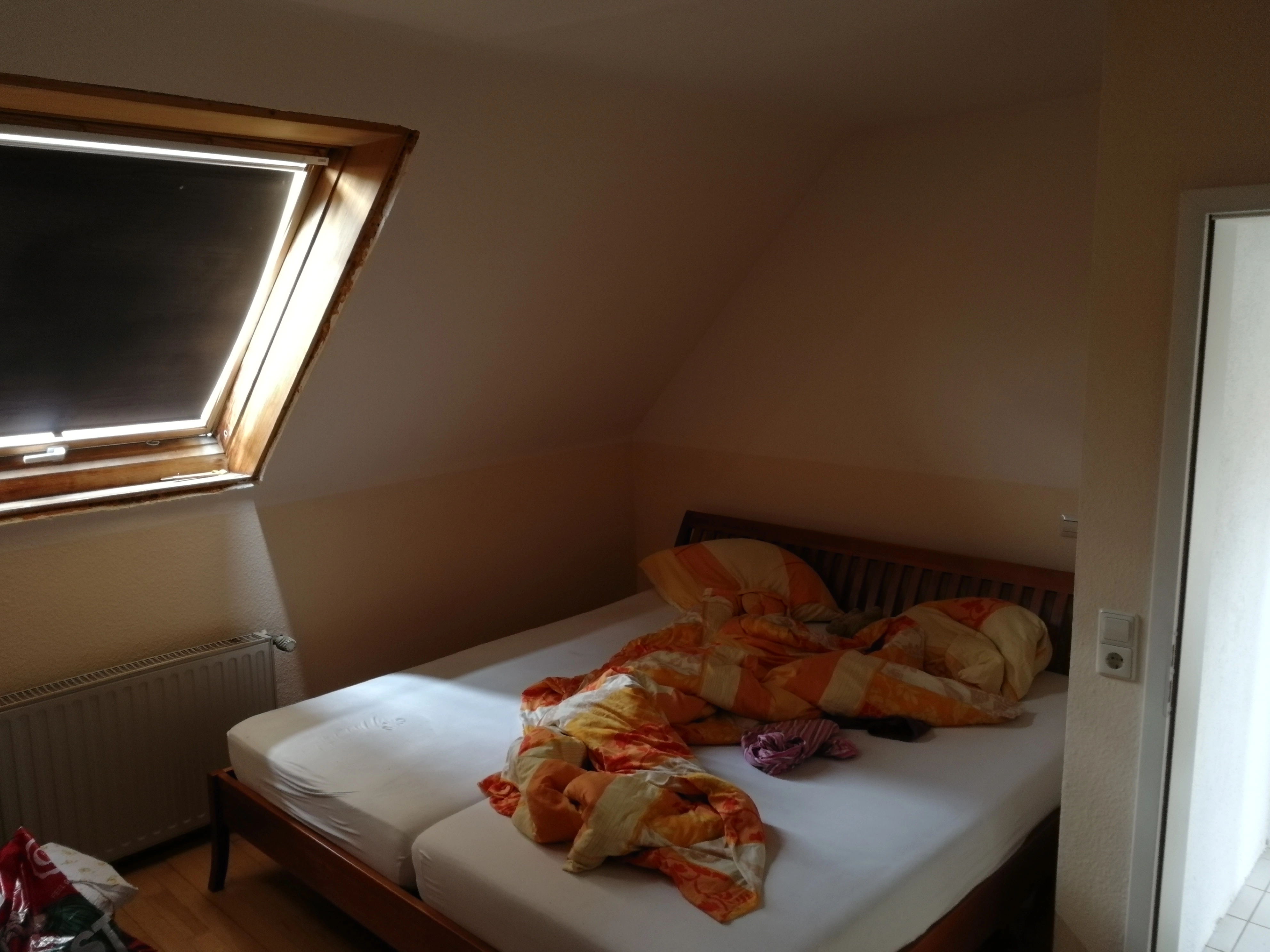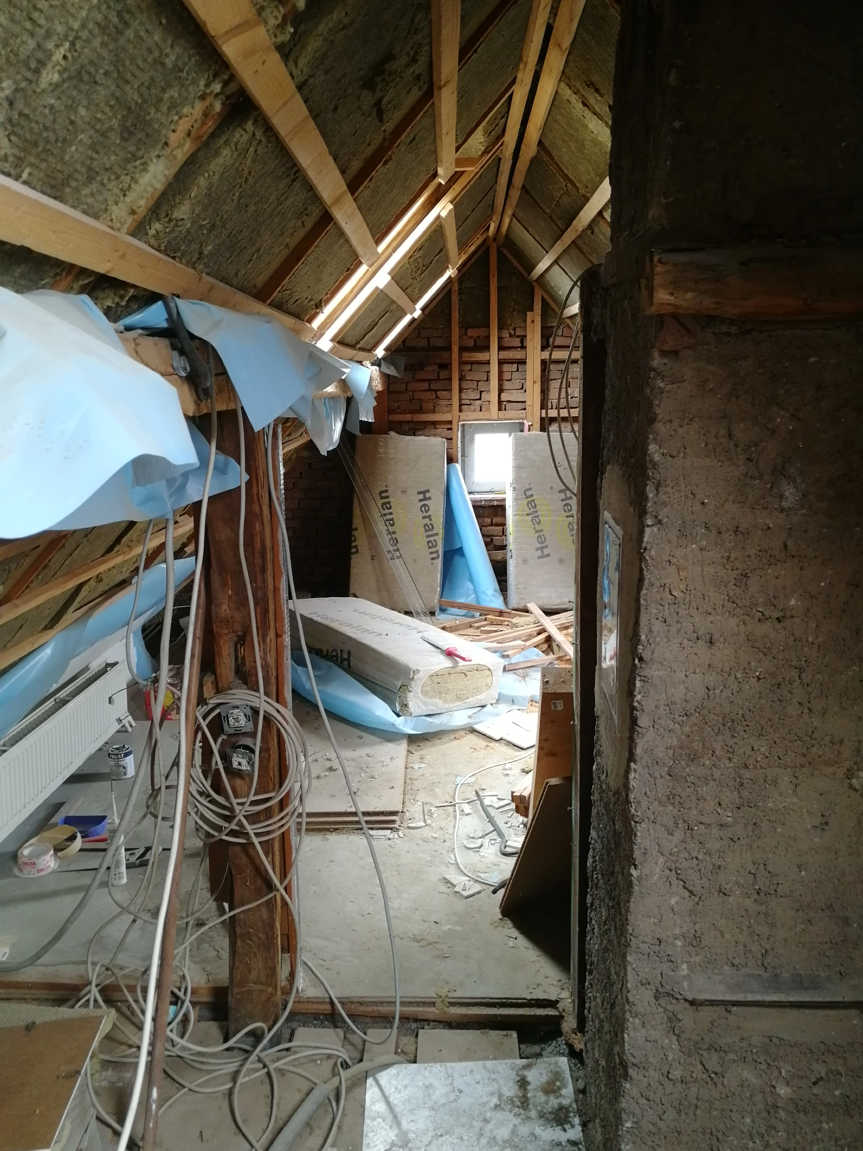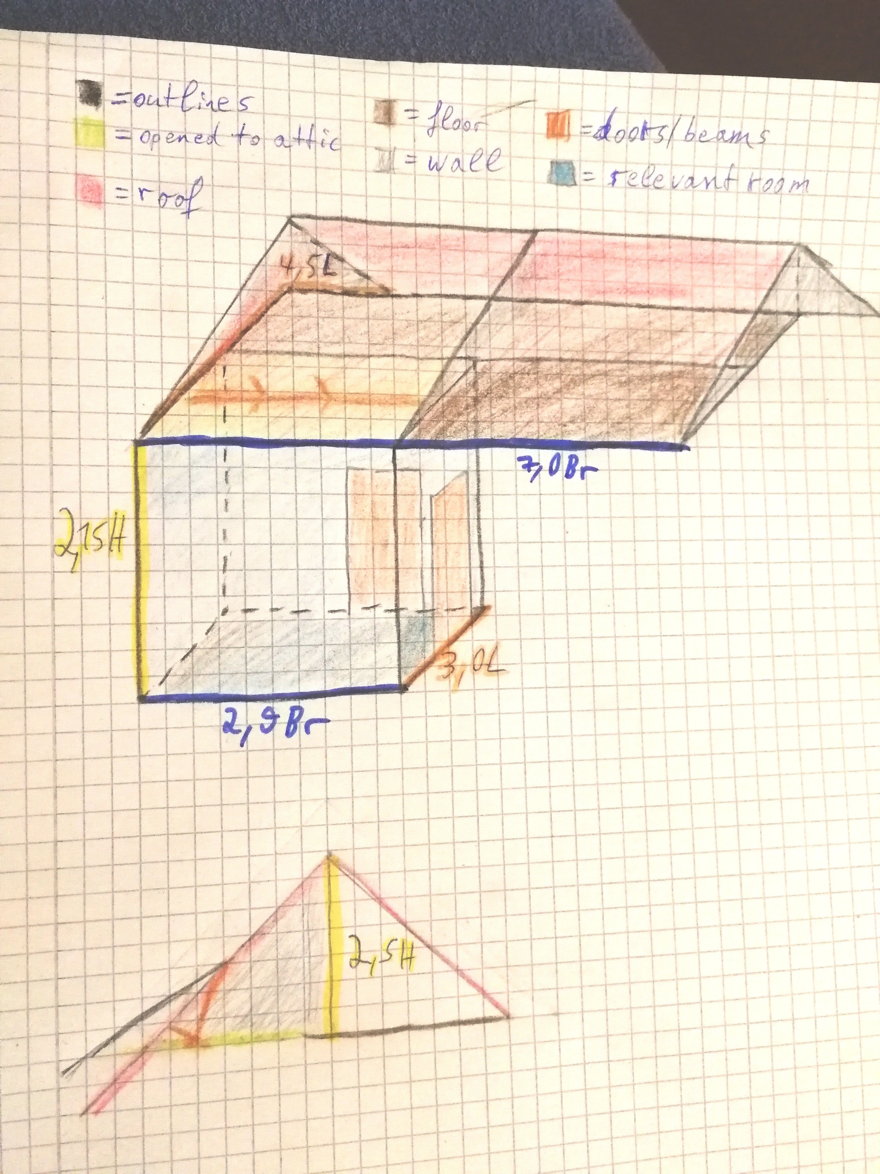 While the rooms length (3 meter) and width (2,9m) is not that special it has an opened ceiling colliding with the attic. It's height is 2,15m at it's lowest, increasing towards the mid of the attic. Now before I get into more details here is a picture of it: