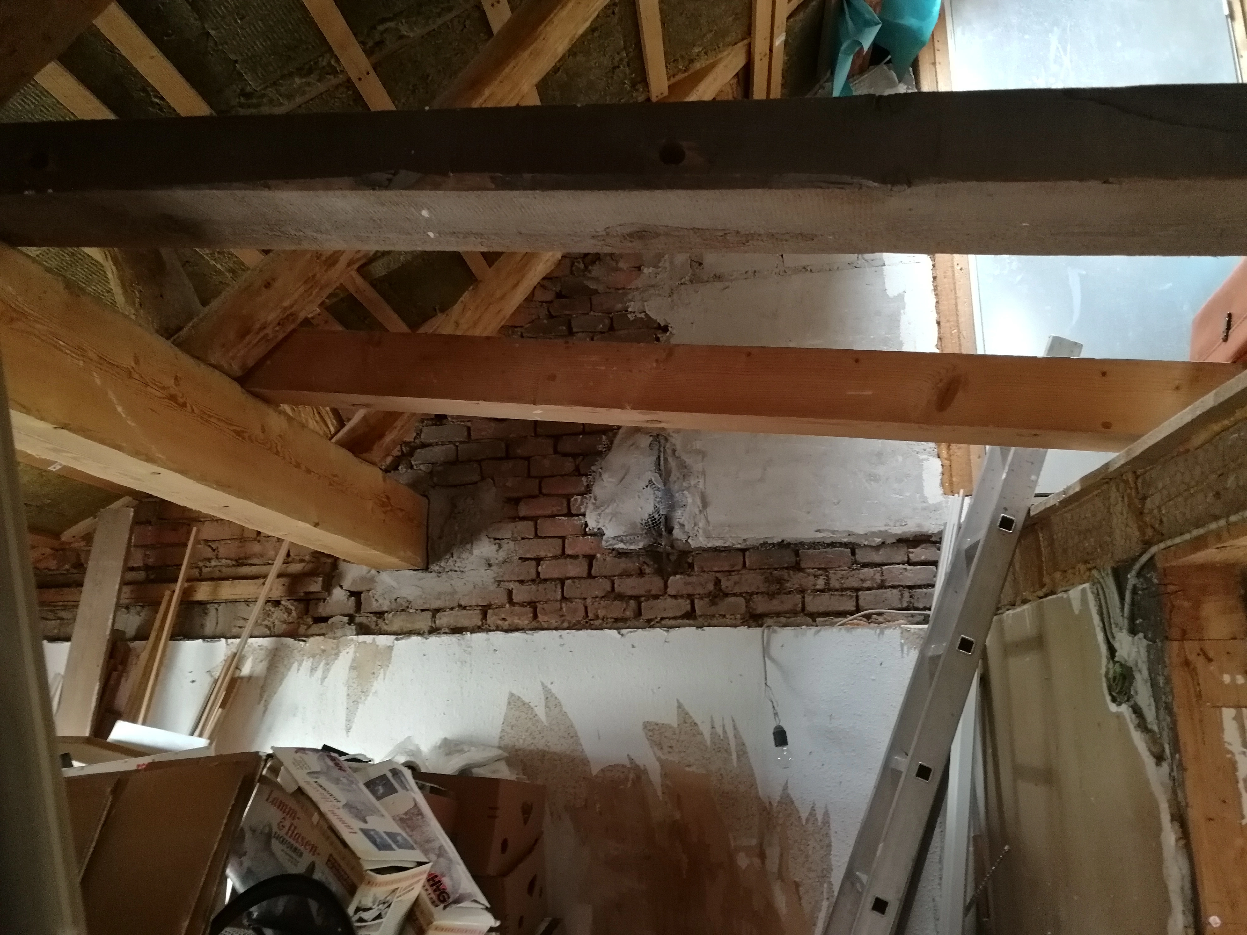 In the second picture there is a side see-through view of the middleish wall that divides the attic into two parts. Note that the pencil line leading away is a correction of the red one as the roof changes it's incline.