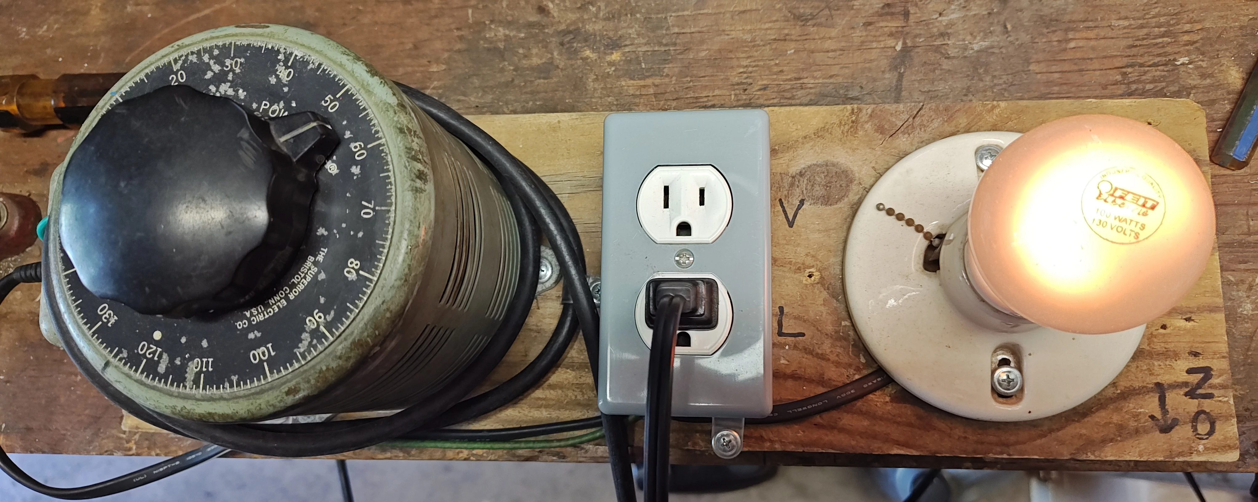 I built this Variac with a light bulb so if there is a short, you don't fry the circuit, the light just lights up. A 100 watt bulb is about one amp depending on voltage. If the light comes on, you know there is a short circuit. There are two outlets, one from the Variac thru the light, and one directly from the Variac. For the picture, I put my heat gun on for a load to show the light. If the light comes on, stop and start looking for the short. Usually it's in the power supply, transformer, or physical damage.