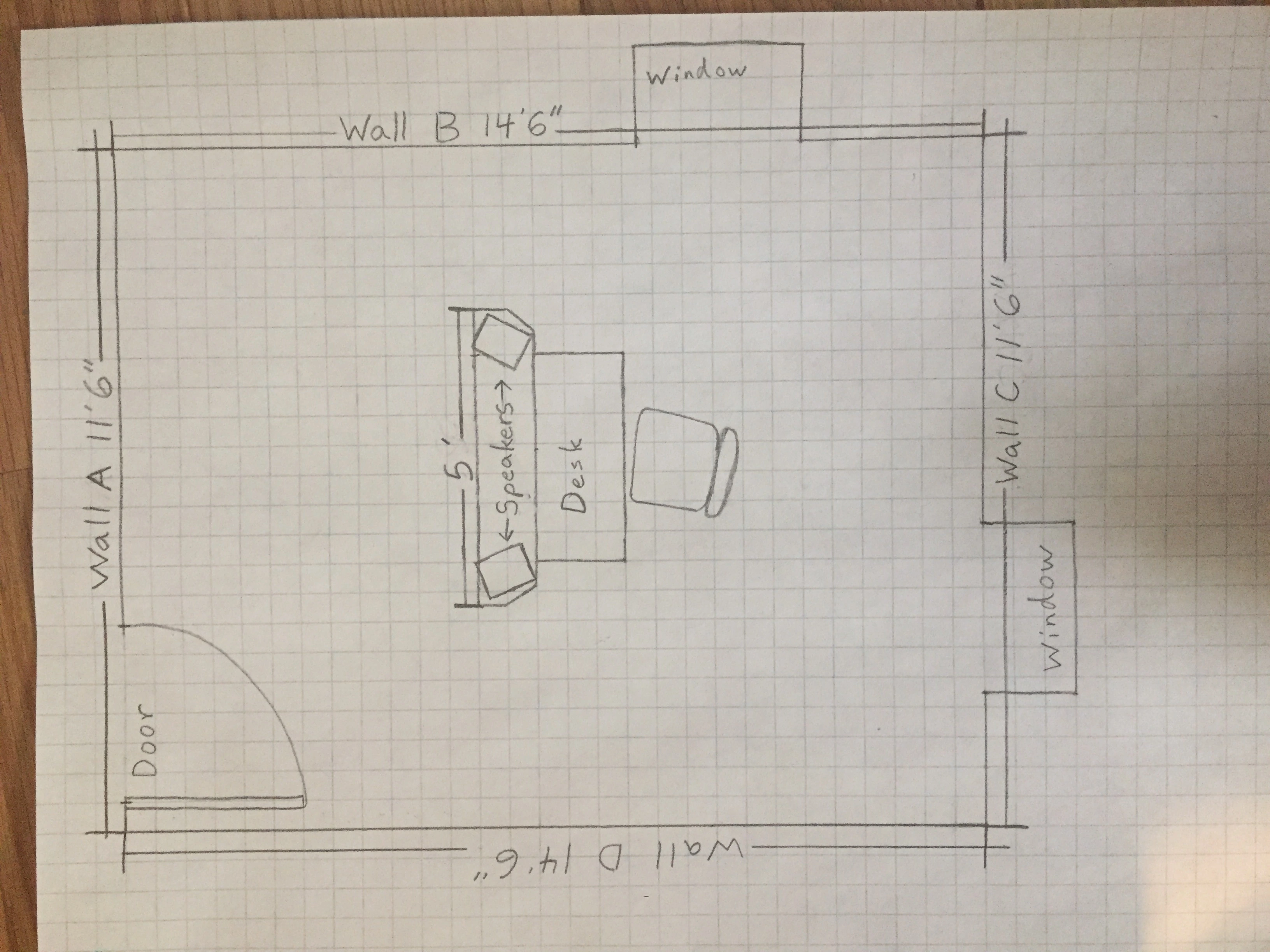 From the research I've done, I'm leaning toward the idea the best position (acoustically speaking) would be to have the desk about a foot (?) out from wall "A",and centered between the edge of the door and the wall A/B corner.