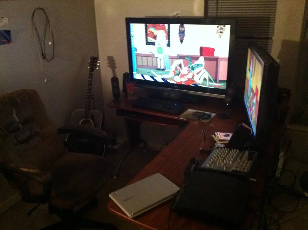 (I know my speakers are fucked, that's something I'll work on another time.) That picture is about 1/4 of the room. I've got a scissor boom stand coming in the mail to attach my mic to the part of the desk closest to the camera, so I'll be recording with my back to the wall with the cables hung on it.